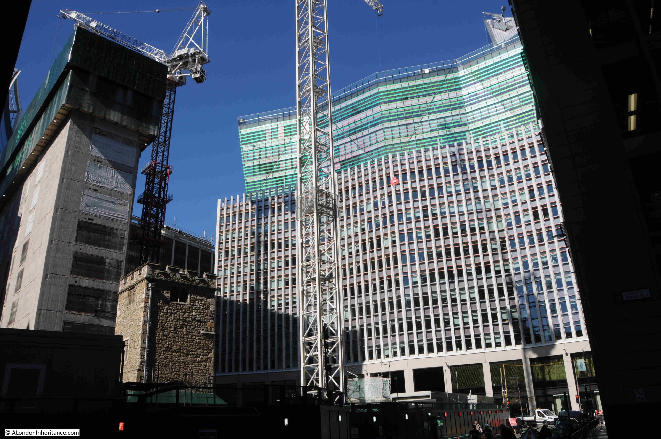 Back on ground level, I walked across to the east of the Fifty Fenchurch building site, next to the tower of All Hallows Staining and looked back at the building with the Garden at 120 on the roof: