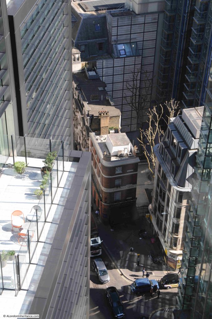 Looking down to a very small part of Fenchurch Street, at the junction with Fenchurch Place, we can see a small part of a terrace of 19th / early 20th century offices, with the distinctive brick built East India Arms pub on the corner: