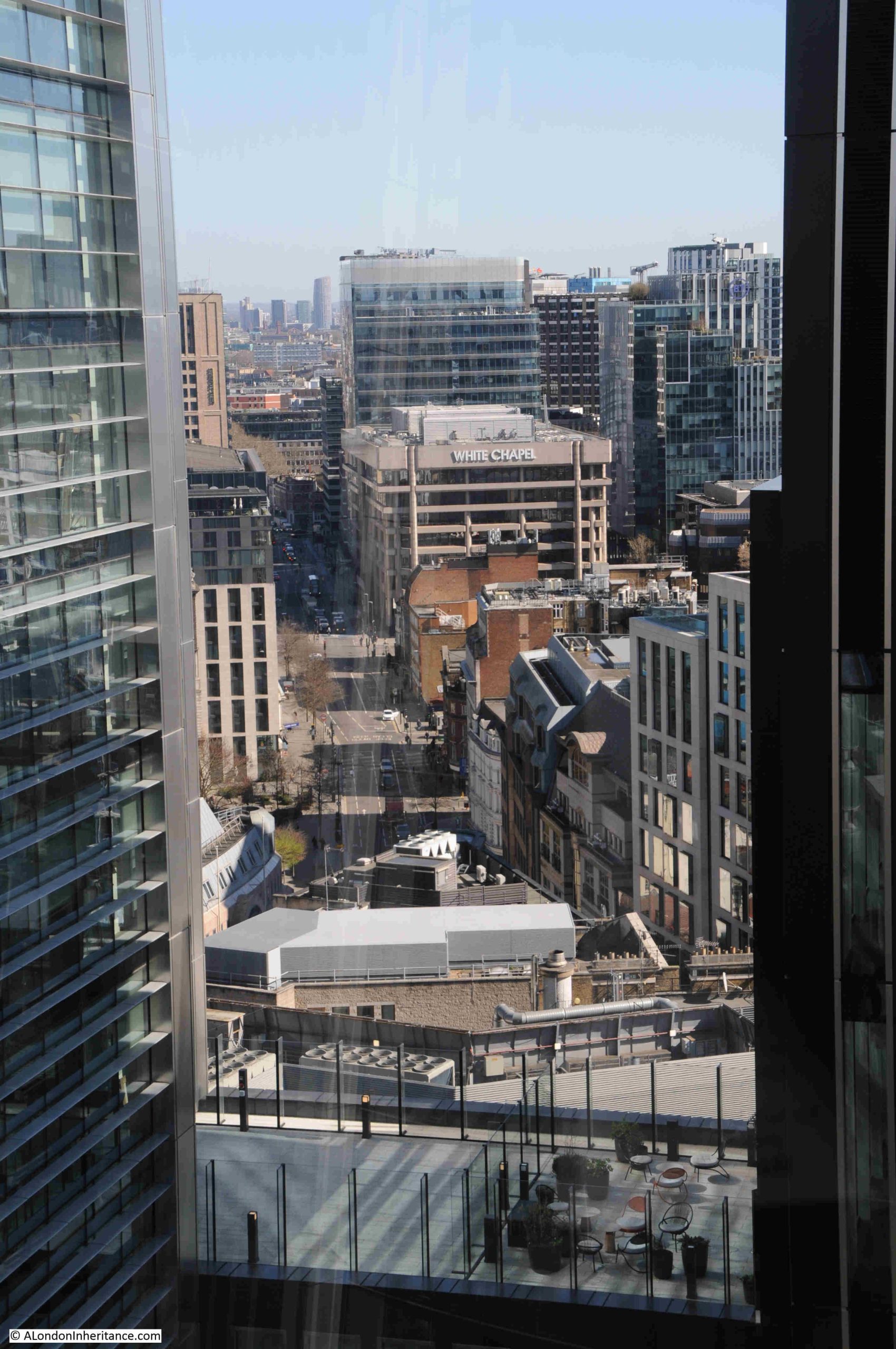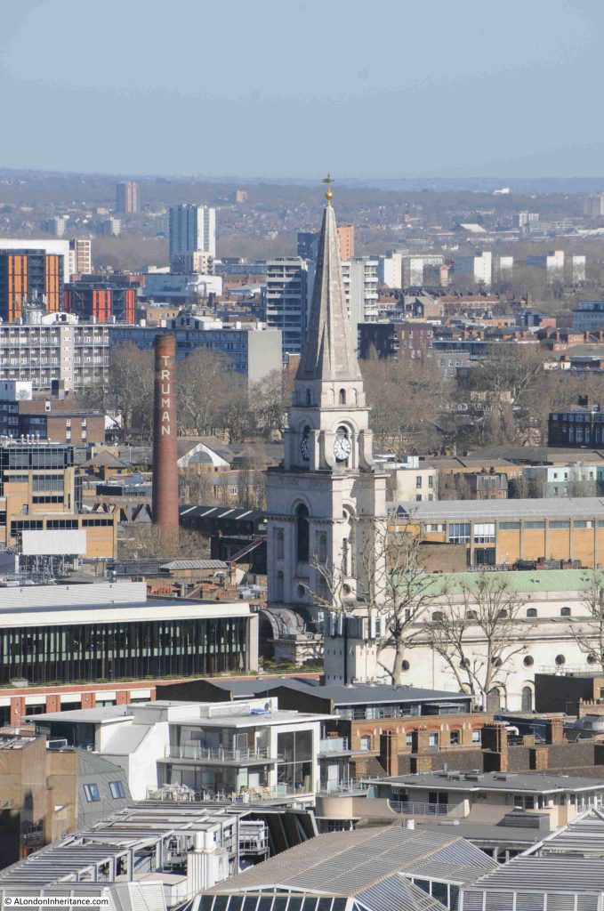 Through another gap we can see Christ Church Spitalfields and the chimney of the old Truman brewery: