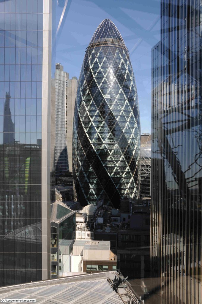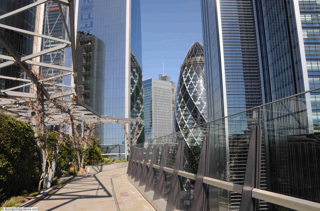 Because The Garden at 120 is on the 15th floor of, by recent standards, a relatively modest building, as you walk to the north of the garden you are looking between gaps in much taller buildings, although this does provide some interesting compositions, where other buildings are framed between towers, including this view of the Gherkin – 30 St. Mary Axe, a building which does not have a viewing gallery at the top, although it did have a bar at the top, which offered good views across London. The bar closed at the start of the year for renovations: