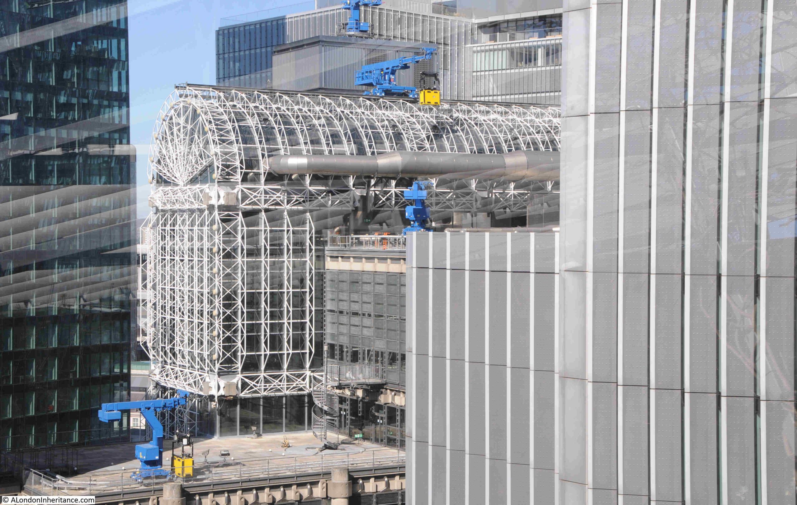 If you look to the lower left of One Leadenhall and the Lloyd’s of London building, you will see a very different structure – the roof of Leadenhall Market: