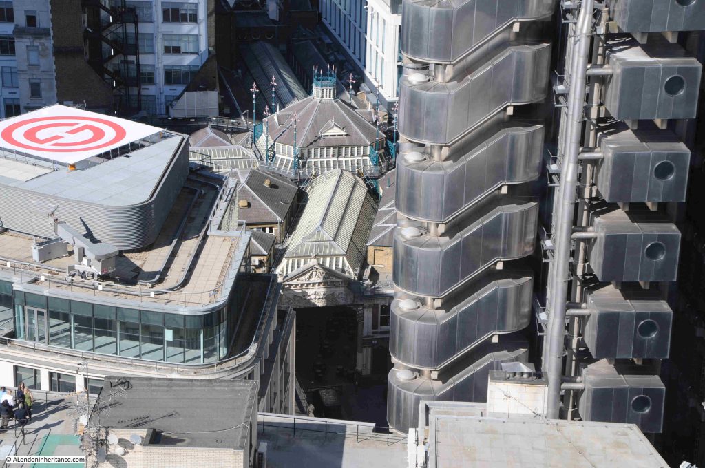 The Lloyd’s of London building is on the right, with the blue cranes along the roof, and the tall tower in the centre is the recently completed One Leadenhall: