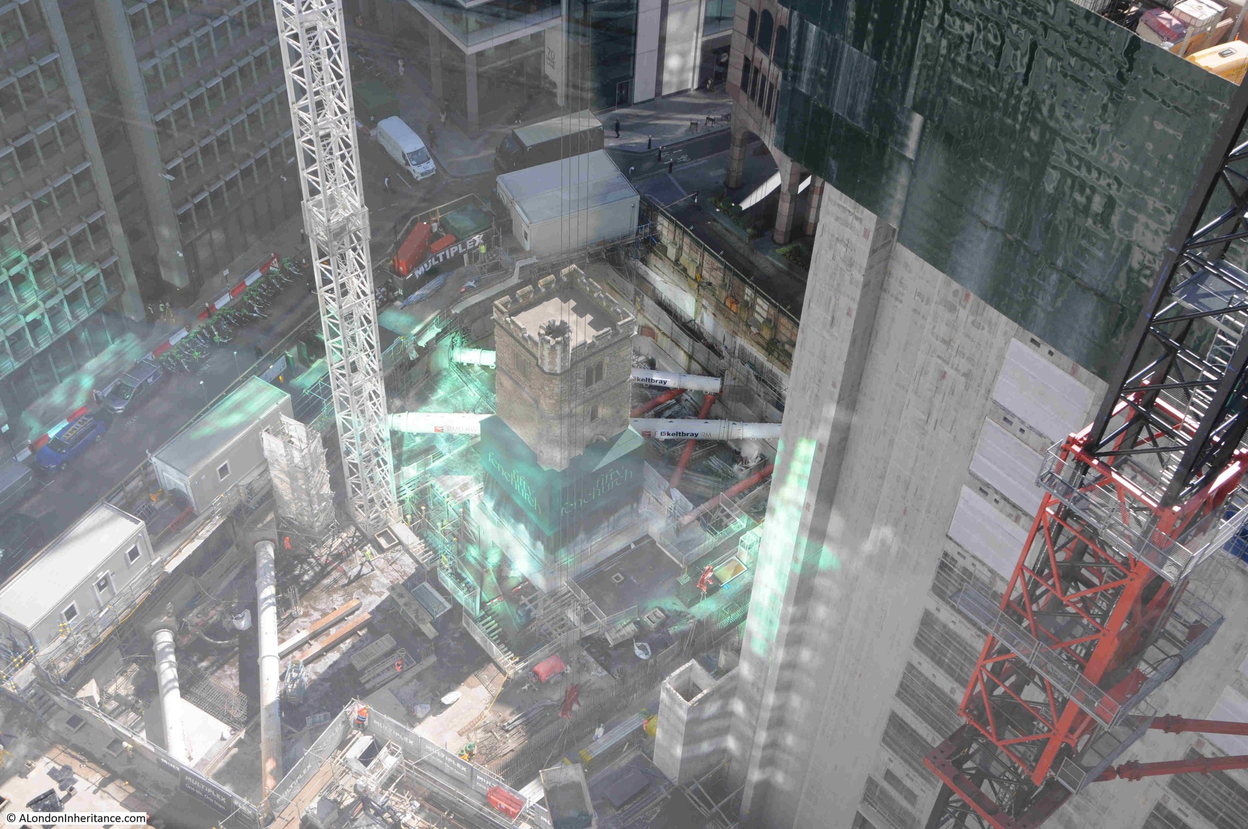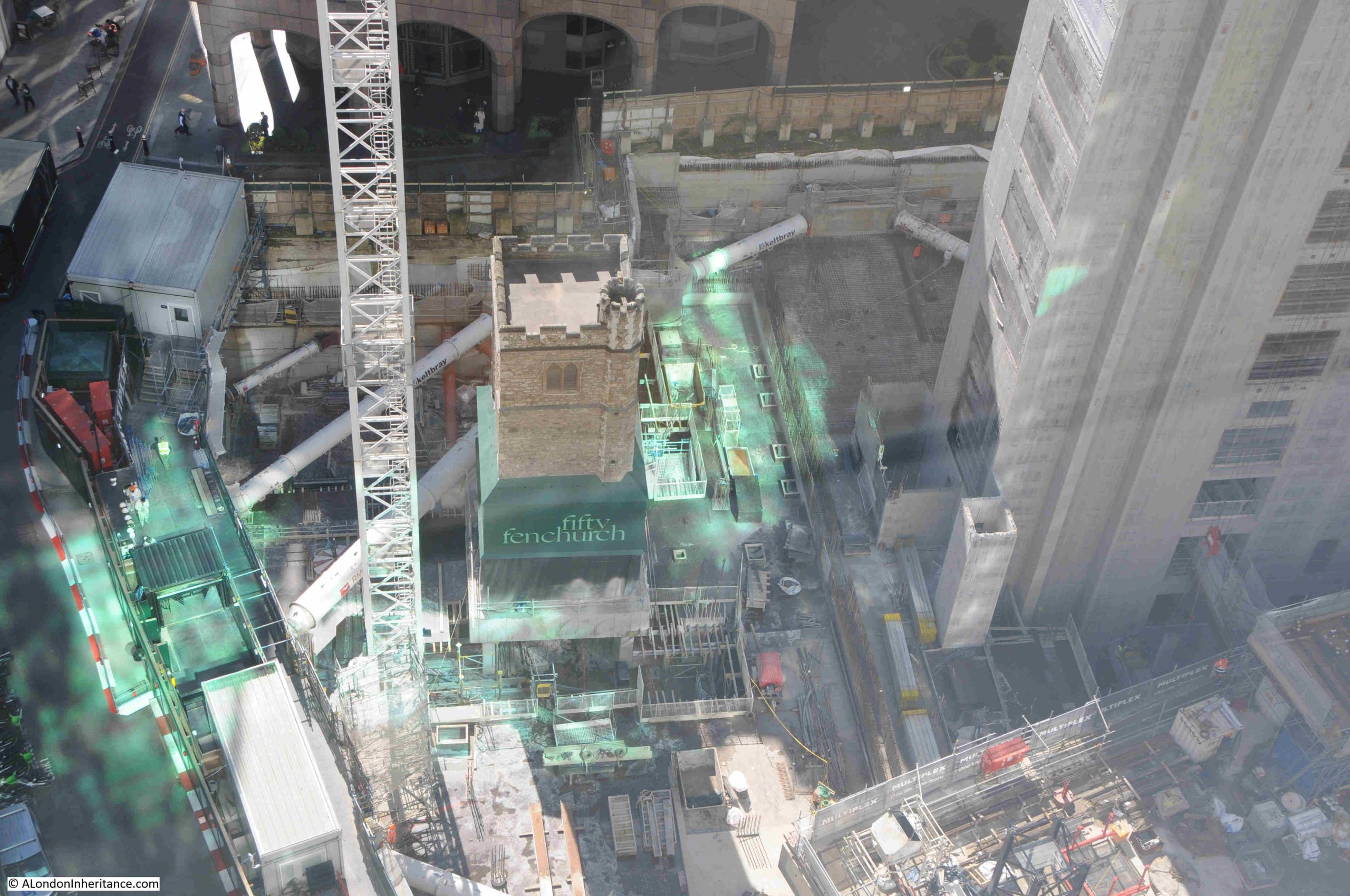A comment from a reader (thanks Brian J) informed that a view of the building site and the church was available from the viewing area at 120 Fenchurch Street – one of the new public viewing spaces on top of a recent City development.