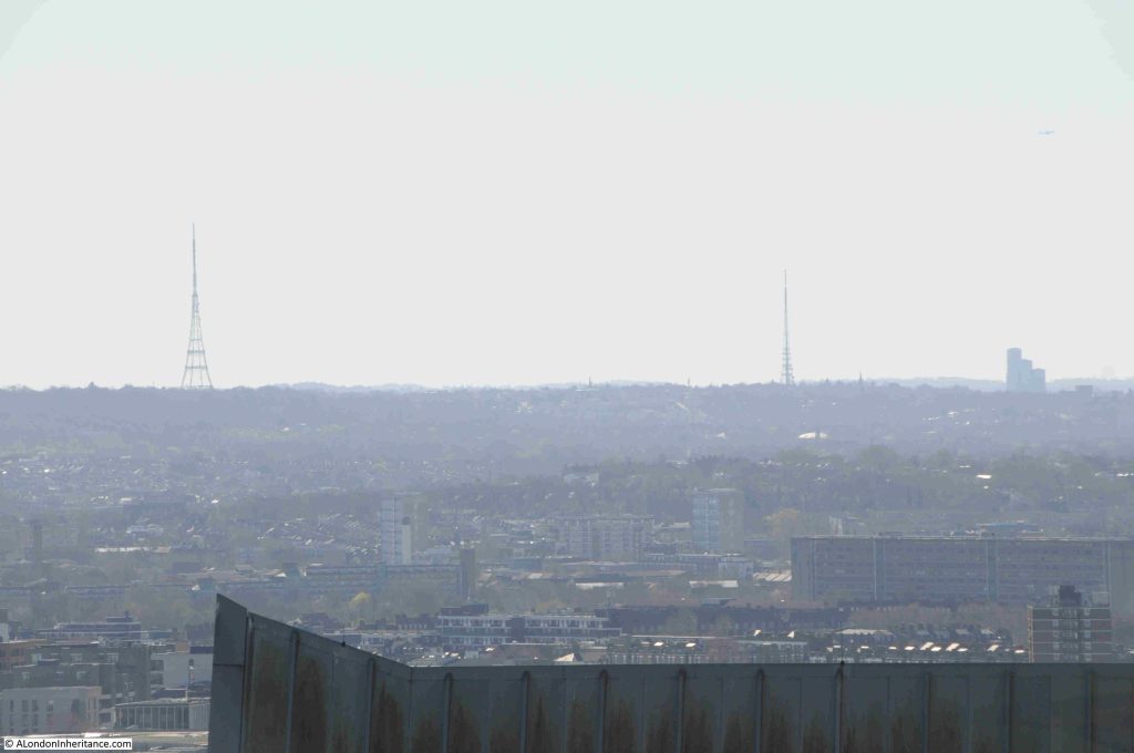 On the horizon, looking to the south, there are two tall radio masts. The one on the left is at Crystal Palace. The mast to the right is at Beaulieu Heights, next to South Norwood Hill: