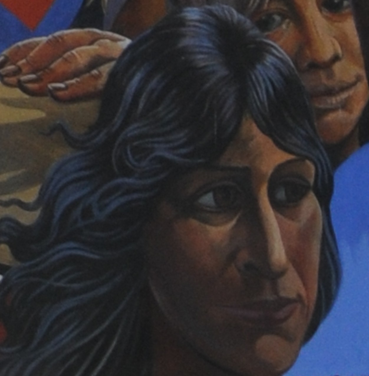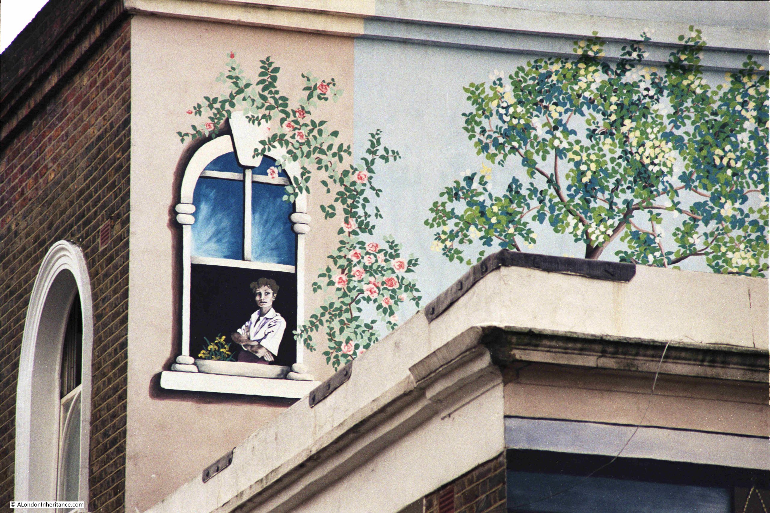 My father’s second photo of the mural was a close up of the part of the mural on the upper floor of the adjacent house, where a woman is looking out of an open window. I wonder if she is the same woman who was going in through the green door?
