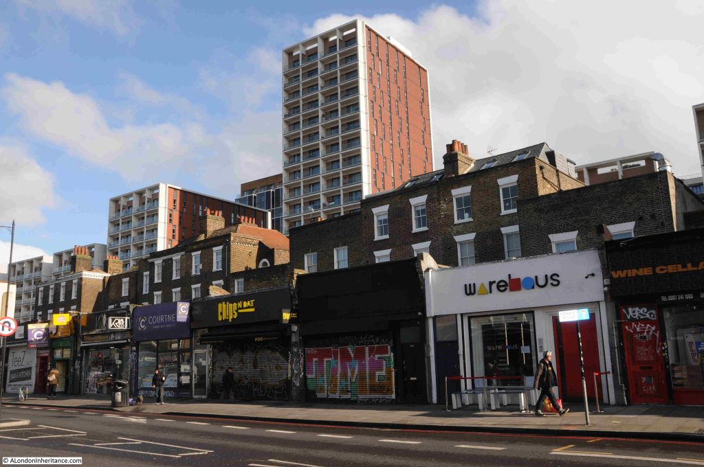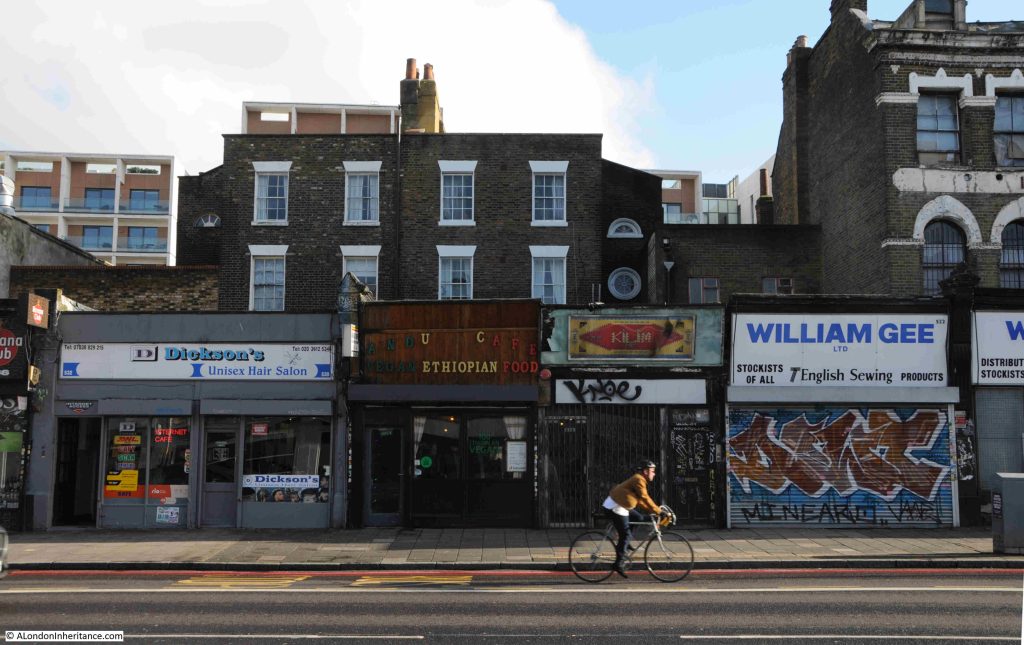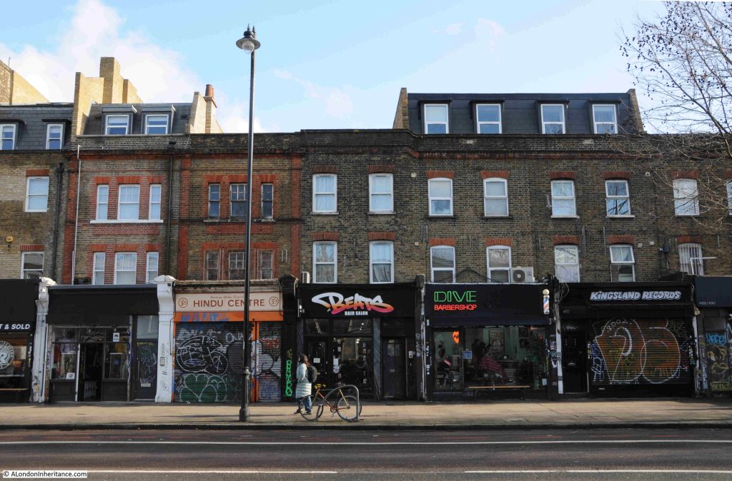 Kingsland Road is also home to terrace houses built during the late 18th and early 19th centuries. These were fine houses at the time, and frequently ground floor shops were added at a later date, built over the gardens that separated the house from the street: