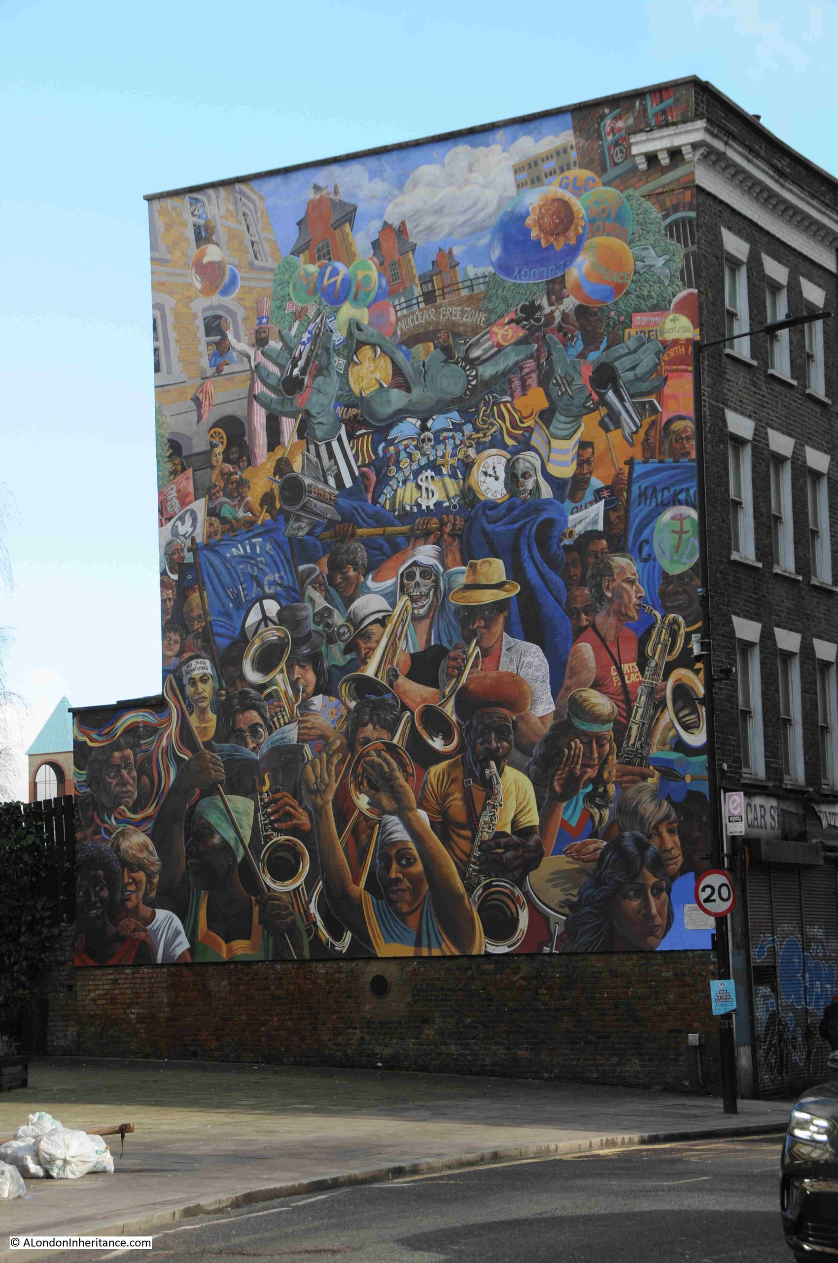 The excellent condition of the Dalston Lane mural compared to the Mildmay Road mural, when they are around the same age, is mainly down to the significant 2014 restoration of the Hackney Peace Carnival mural.