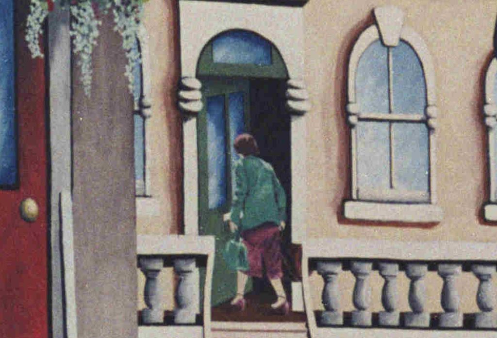 In the 1980s photo, we can see details which raise questions, for example there is a green door reached by some stairs leading up from the grass. The door is partly open, and a woman carrying two bags is going through the doorway.