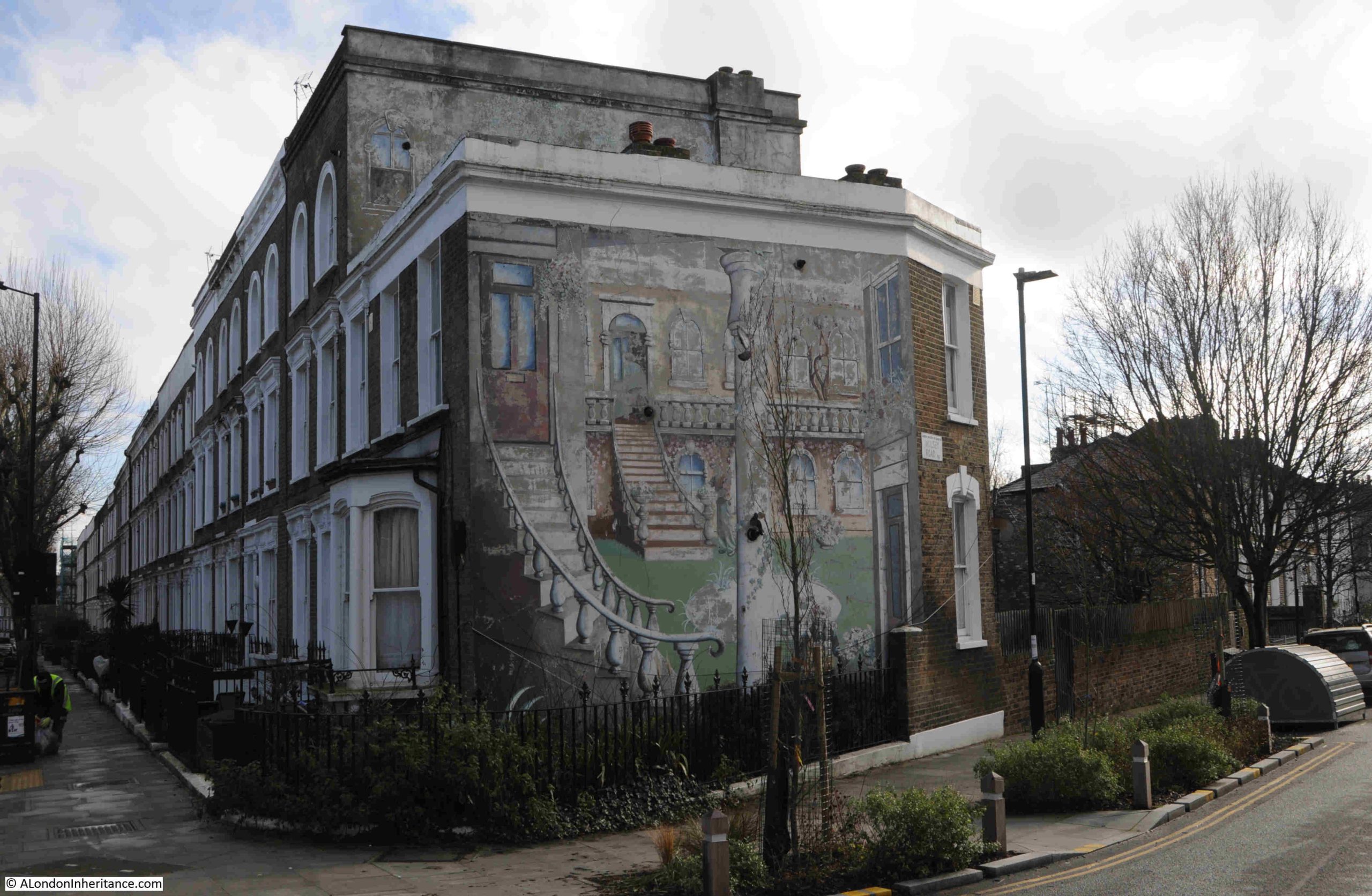 In Wolsey Road we can see that the three dimensional aspect of the mural is still clear. The mural covers a flat wall, and as well as the individual elements of the mural, the two sets of stairs, and the column, the two windows on the right of the mural are painted in such as way as to give the impression that they are on an angled wall: