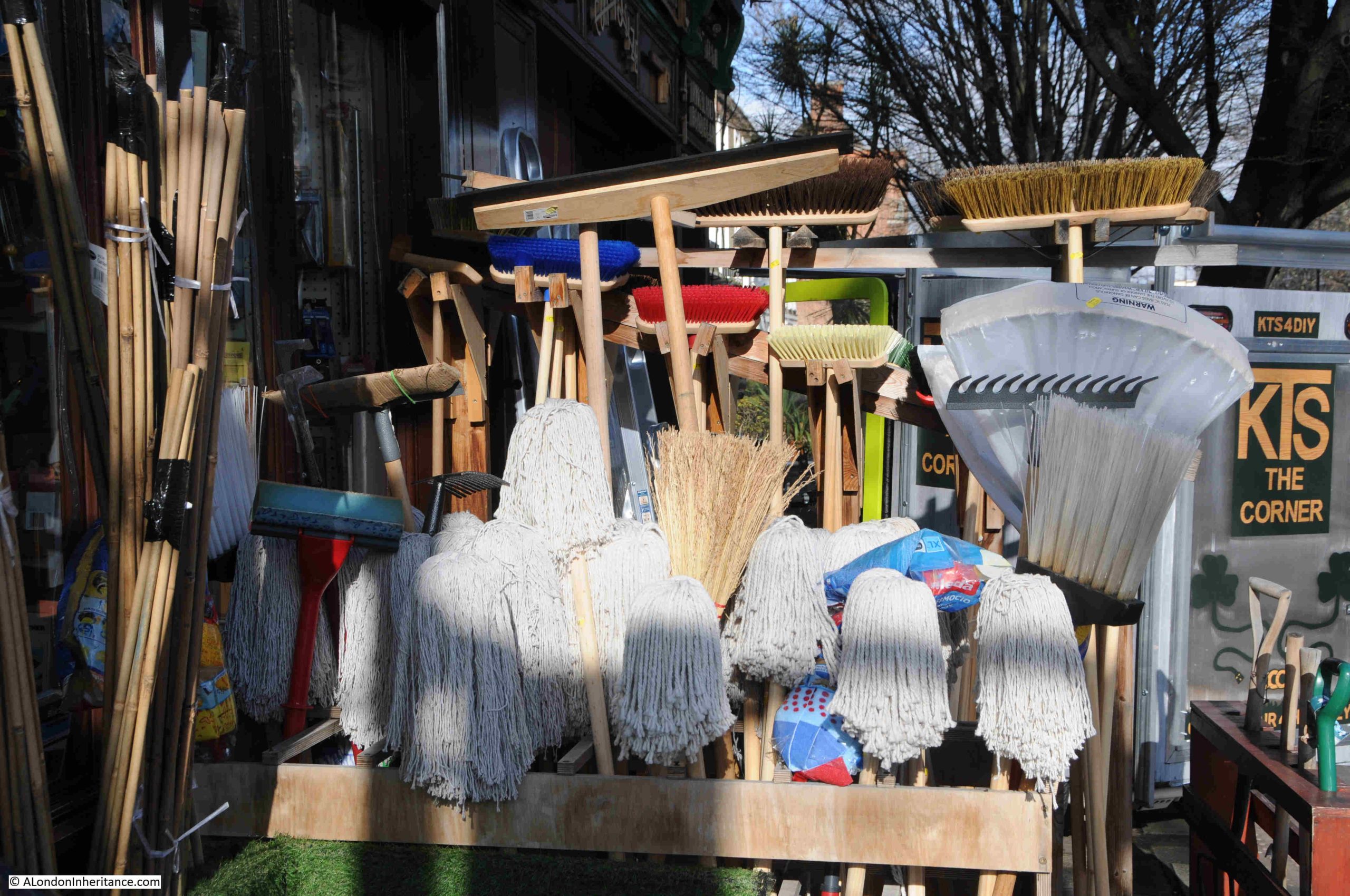 Mops and brooms in the February sunshine on Kingsland Road: