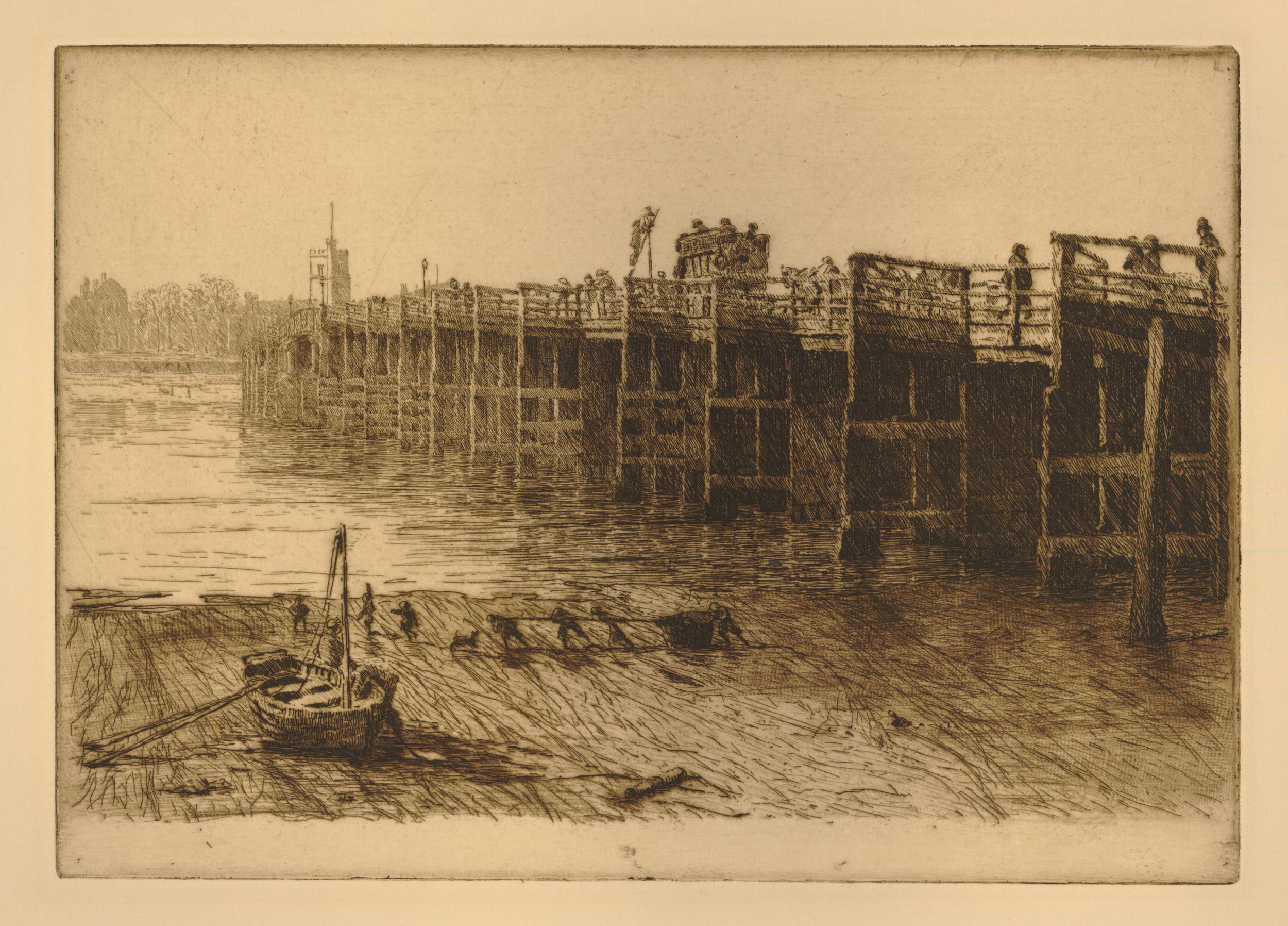 The first bridge was of wooden construction. There was much opposition from the watermen operating the ferry, as the bridge would have destroyed their business. Compensation and pensions were needed to address the waterman’s complaints.