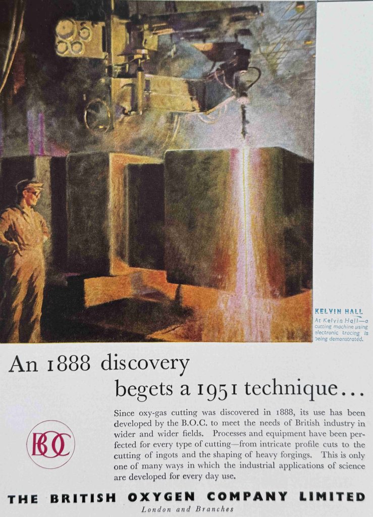 Rather ironically, given the exhibitions focus on industrial power, Scotland was suffering power cuts in 1951, and on the 15th of June, 1951, many Scottish newspapers reported that “Exhibition Plunged In Darkness. The £400,000 Exhibition of Industrial Power at the Kelvin Hall, Glasgow, was plunged into darkness for almost an hour today by an unexpected power cut. Visitors who had just entered the hall to tour the exhibition were left standing in total darkness where a few seconds before they had been gazing at vivid artificial lightning flashes”.