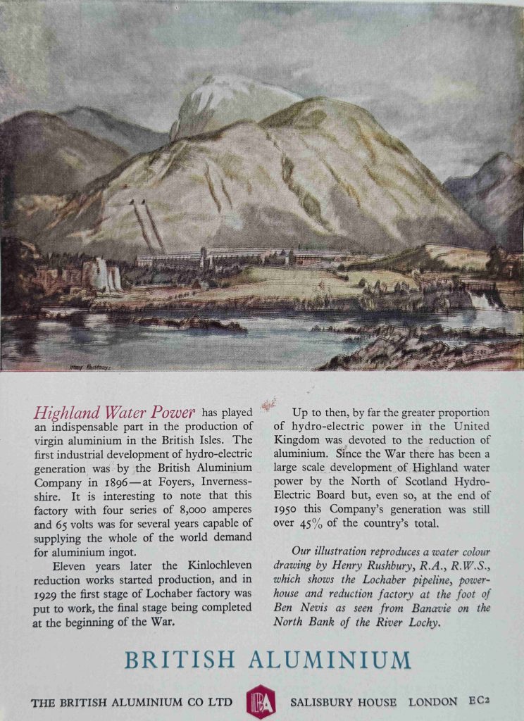British Aluminium – another company that has disappeared, however the Lochaber hydro-electric plant and pipelines shown in the illustration in the advert are still in use, generating electricity for an aluminium smelter owned by Alvance British Aluminium, the one remaining aluminium smelter in the UK: