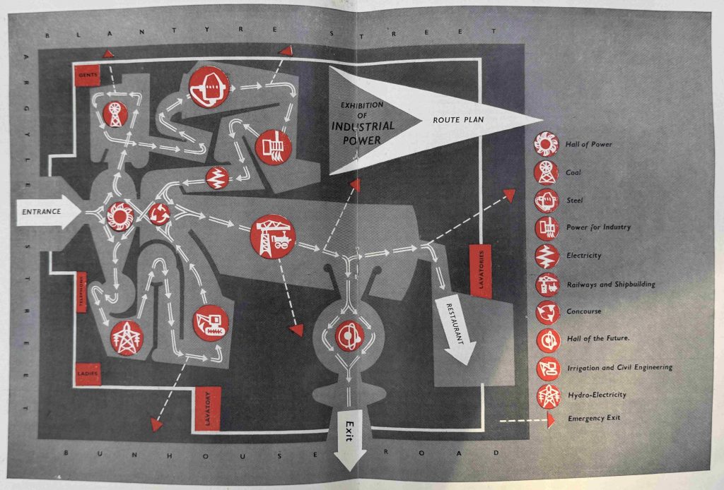 As with the other exhibition sites, at Glasgow, the story was presented to the visitor as they walked through a series of Halls which focused on individual aspects of the overall theme. Walking through the Glasgow exhibition, there was a Hall of Power, of Coal, Steel, Power for Industry, Electricity, Railways and Shipbuilding, Irrigation and Civil Engineering and Hydro-Electricity.