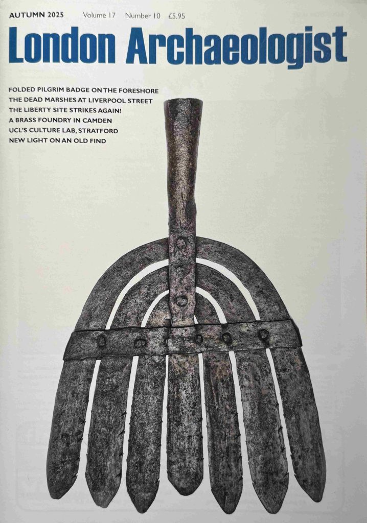 The cover image is of an iron eel spear, and to give an idea of the type of contents, the autumn edition features excavations at 14-19 Tottenham Mews in Camden as well as excavations at 1 Liverpool Street which has the title “The Dead Marshes” to highlight the historic location of the place.