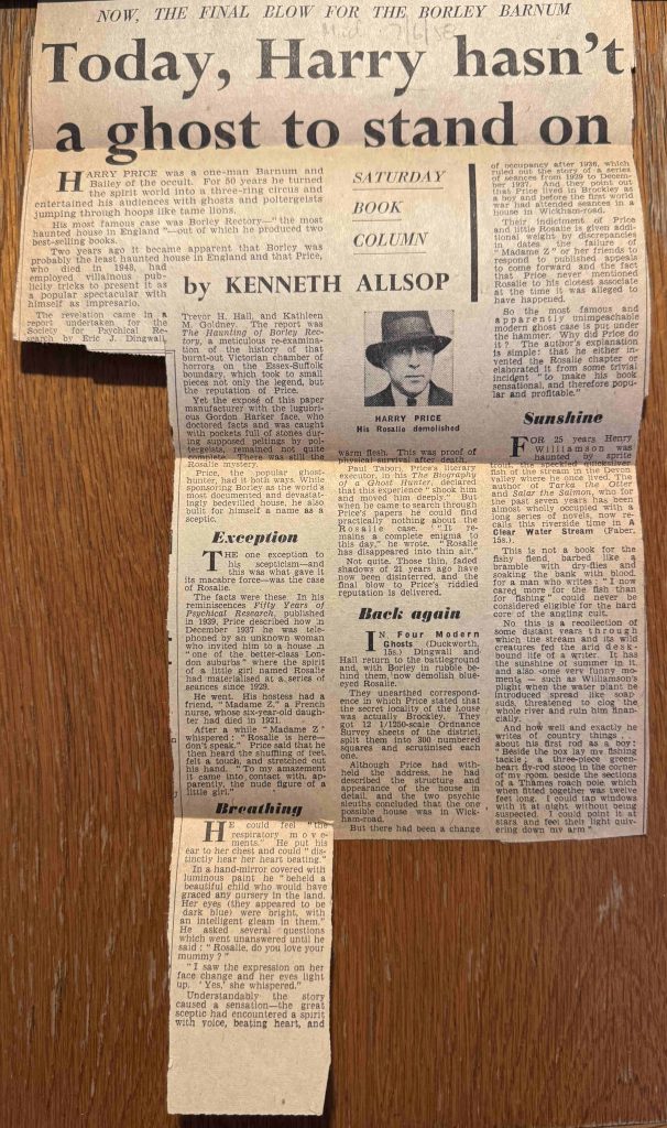My father had a copy of the book “The End of Borley Rectory” by Harry Price, and inside there is a cutting from the Daily Mail from the 7th of June, 1958, with the headline “Today, Harry hasn’t a ghost to stand on”.