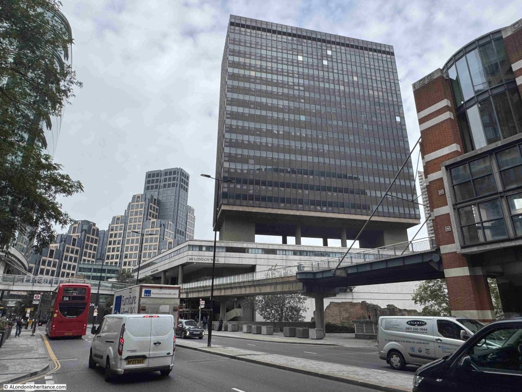 Another, similar tower and podium building that may well soon be demolished is Bastion House (140 London Wall), which sits on top of the old Museum of London site. The photo below shows the building, and also highlights how the office block is suspended above an open space, with only a few central support columns, along with the wider blocks at the two sides of the structure for additional support, lifts and services, for the 17 storeys of the building above: