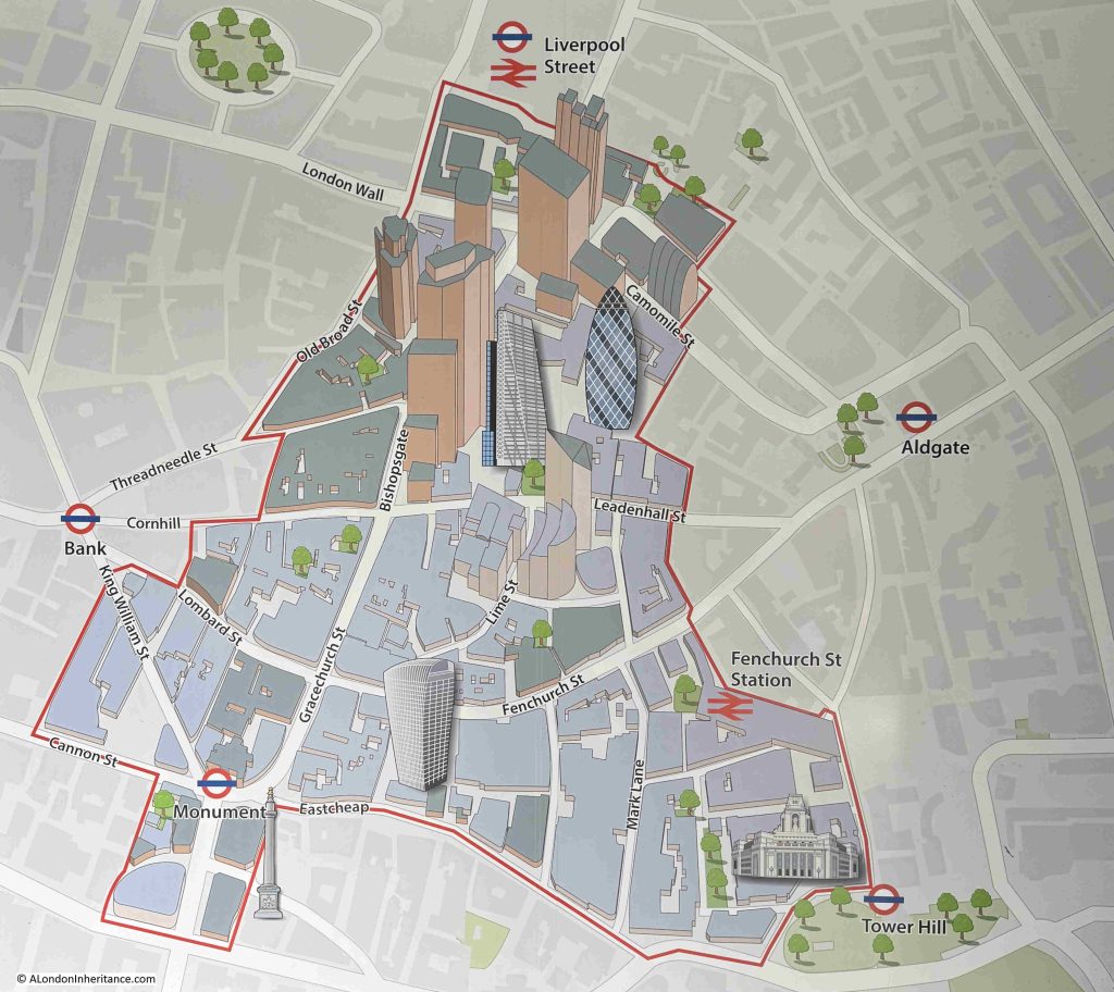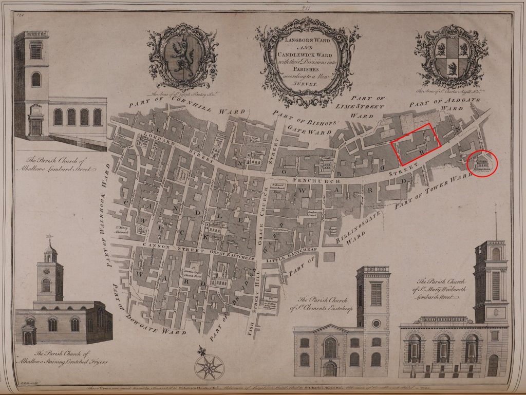 Fountain House is within Langbourn Ward, and never one to pass an opportunity to include an old map, the following map is of Langbourn Ward, and I have marked the area of the Fountain House redevelopment with a red rectangle, and a red circle is around the church of All Hallows Staining, which is a small part of the redevelopment on the opposite side of Fenchurch Street (© The Trustees of the British Museum. Shared under a Creative Commons Attribution-NonCommercial-ShareAlike 4.0 International (CC BY-NC-SA 4.0) licence.):