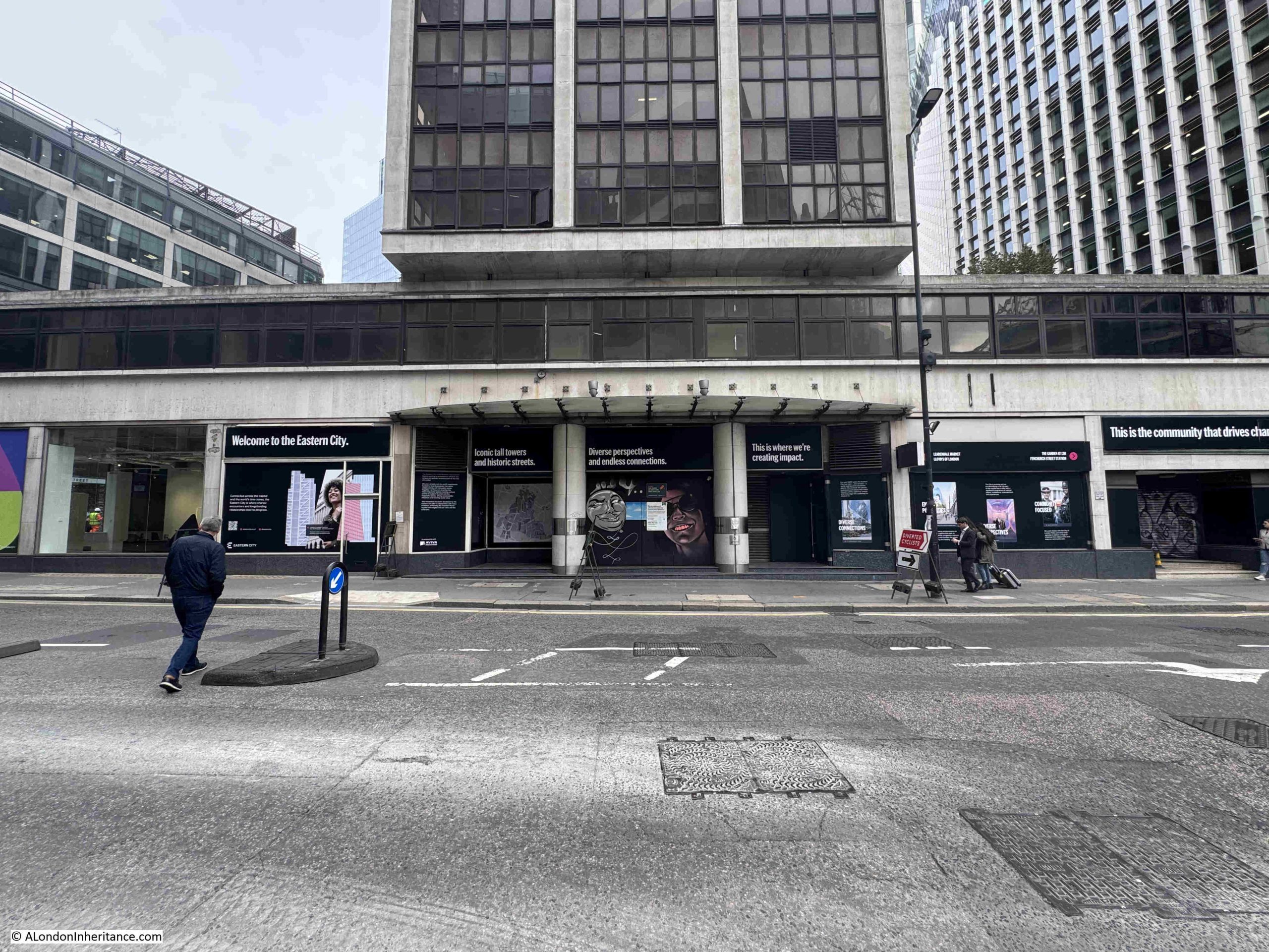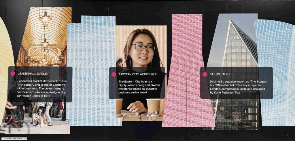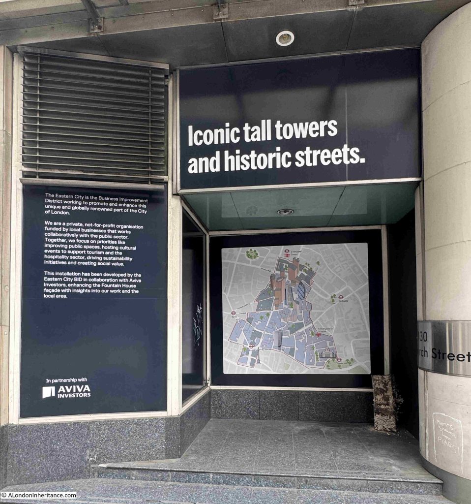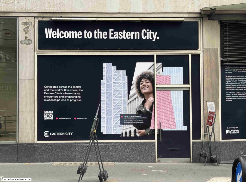 This advertising display’s one of my pet hates about the way parts of London are often rebranded, as apparently the area surrounding Fountain House is now “Eastern City”: