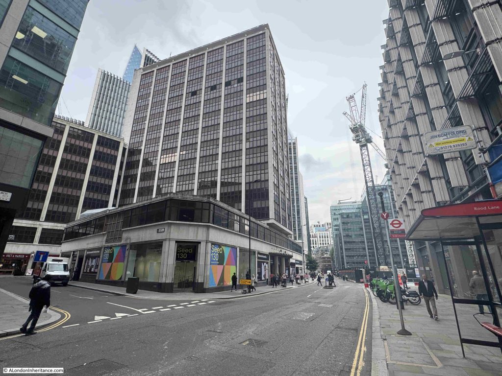 130 Fenchurch Street is better known as Fountain House, a rather unique building in the City of London, and one I wrote a bit about in 2018 when demolition was expected in the next couple of years, however I suspect that Covid delayed any work, and seven years later it looks as if Fountain House will finally become one of the many City buildings that become a memory for those that worked in the building, or remember the building from walks along Fenchurch Street: