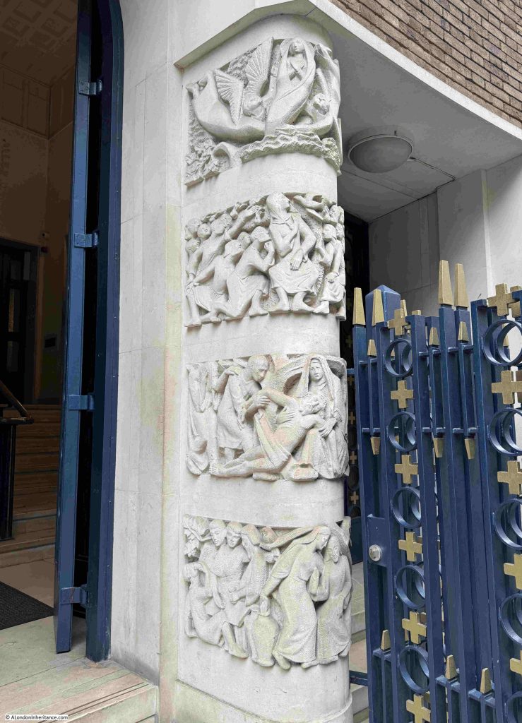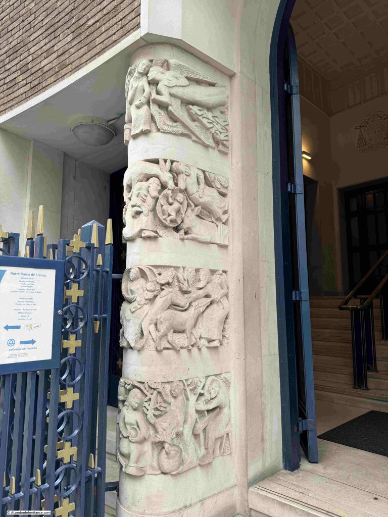On either side of the entrance, there are carved pillars. These show scenes in the life of the Virgin and are by pupils of Professor Saupique: