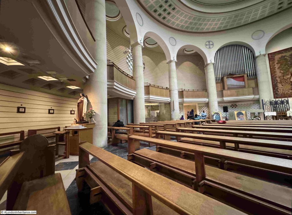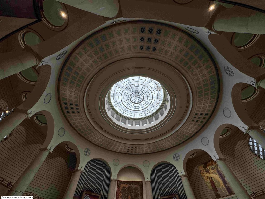 The interior is also a 1955 rebuild of the original church, but seems to follow the same circular plan as the first French church on the site, a building which made use of the building constructed as a panorama, and used by Burford’s panorama in the mid 19th century.