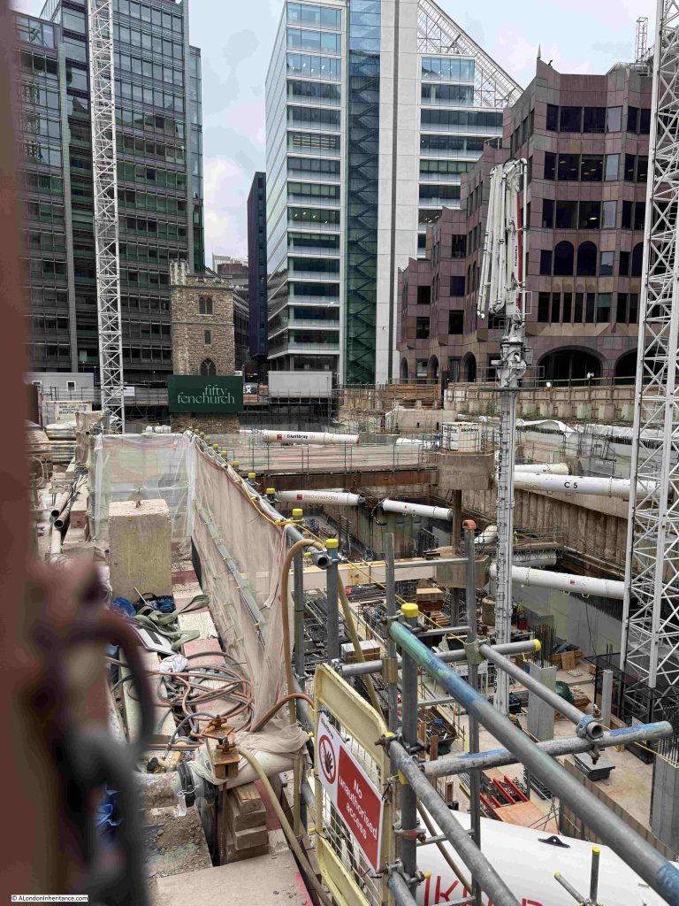 The hoarding around the site obscures any view of the construction site. It is a real shame that construction companies hide their work as these are remarkable examples of construction and engineering.