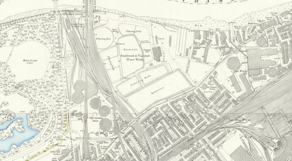 In the following map extract from the 1894 revision of the OS map, the gas holders can be seen to the lower left of centre as a collection of circles amongst the railway lines. To the right side of the map, three circles and the works of the London Gas Light Company can be seen at Nine Elms. It was here that gas was made from coal, which had been brought along the Thames and unloaded at the Dolphin which can be seen on the foreshore of the river. In the centre are the reservoirs and filter beds of the Southwark & Vauxhall Water Works. It was on the site of the water works that Battersea Power Station would be built: