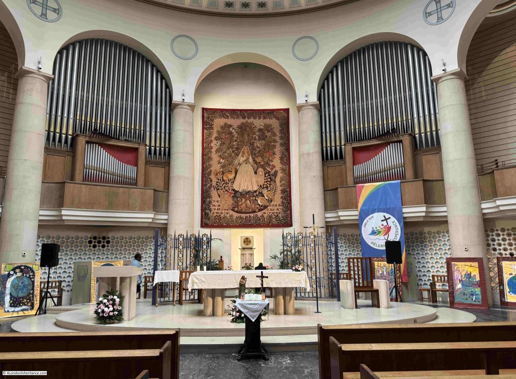 There are a number of works of art within the church. Behind the altar is a large tapestry, designed by the Benedictine monk Dom Robert de Chaumac on the theme of Paradise on Earth: