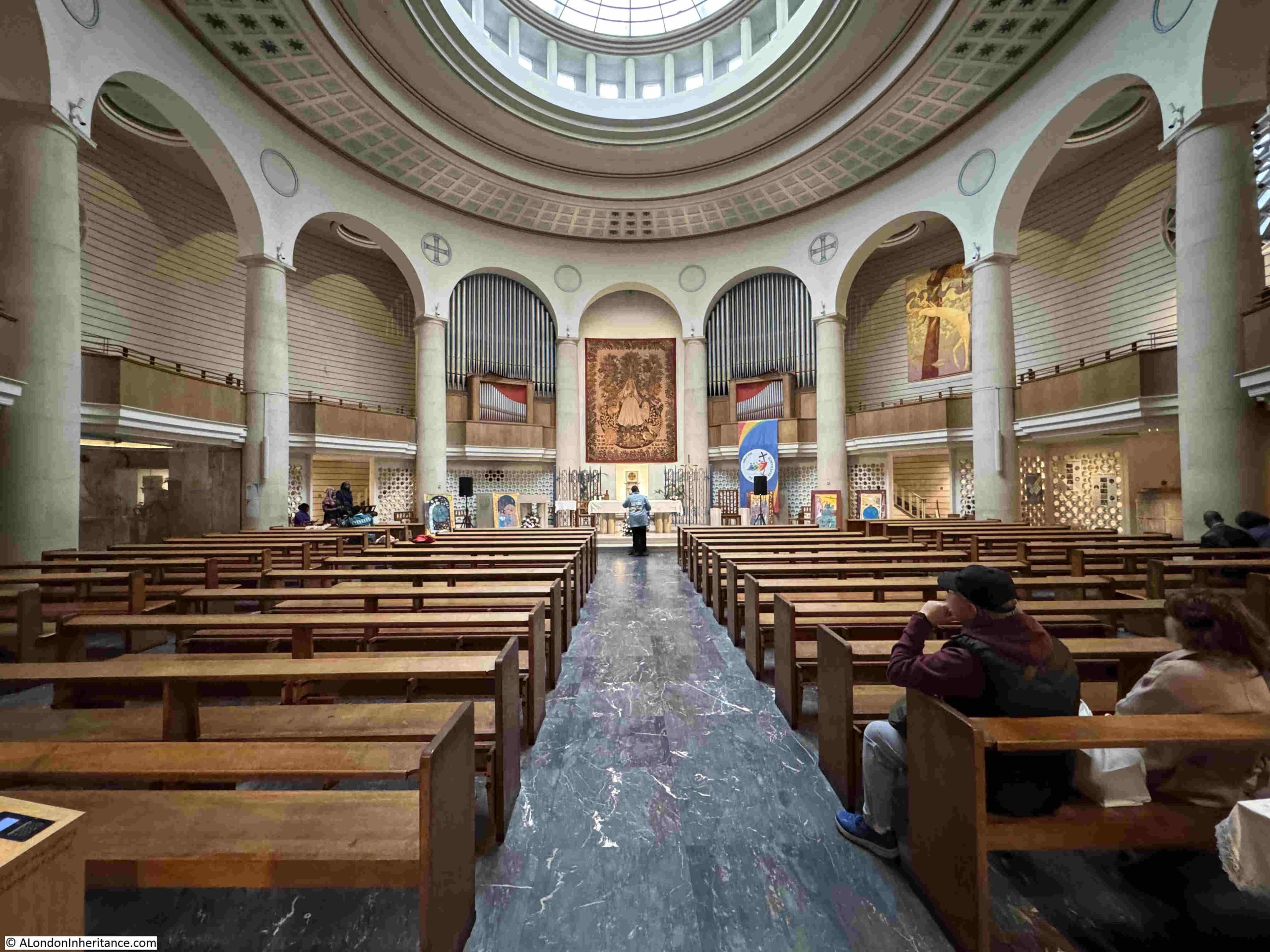 The interior is also a 1955 rebuild of the original church, but seems to follow the same circular plan as the first French church on the site, a building which made use of the building constructed as a panorama, and used by Burford’s panorama in the mid 19th century.