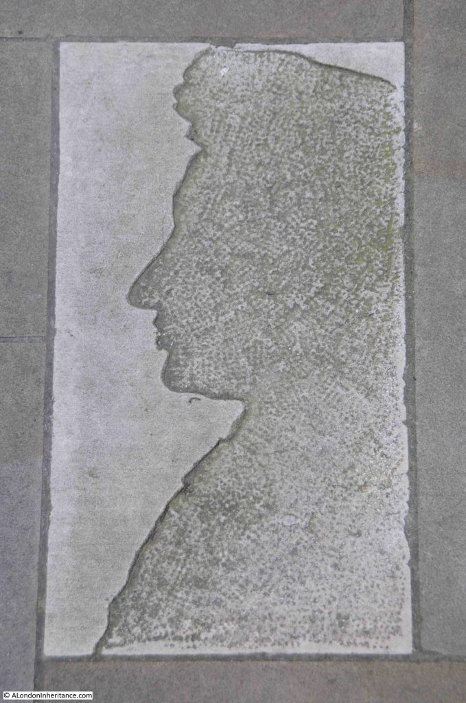 As you walk out of the gardens towards the south, there is a paving stone that looks as if a large part of the top layer of the stone has been worn away, however the image is meant to be viewed as you enter the gardens, so turning round reveals a profile of Pepys in stone:
