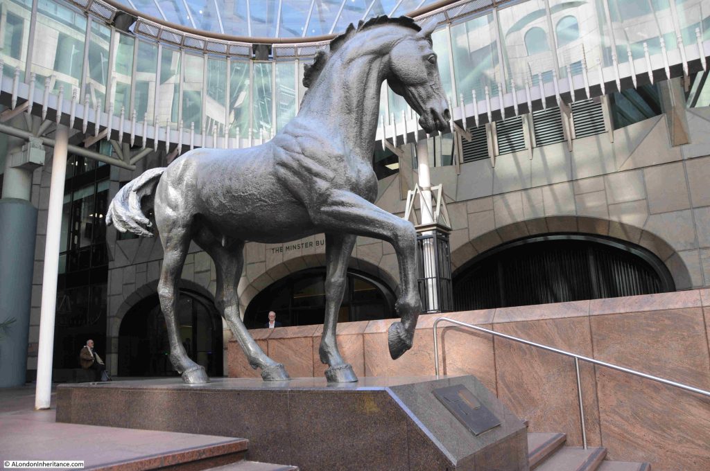 The main entrance from Mincing Lane is up a flight of steps to a wide open space, where the three bronze horses stand on plinths looking down the steps.