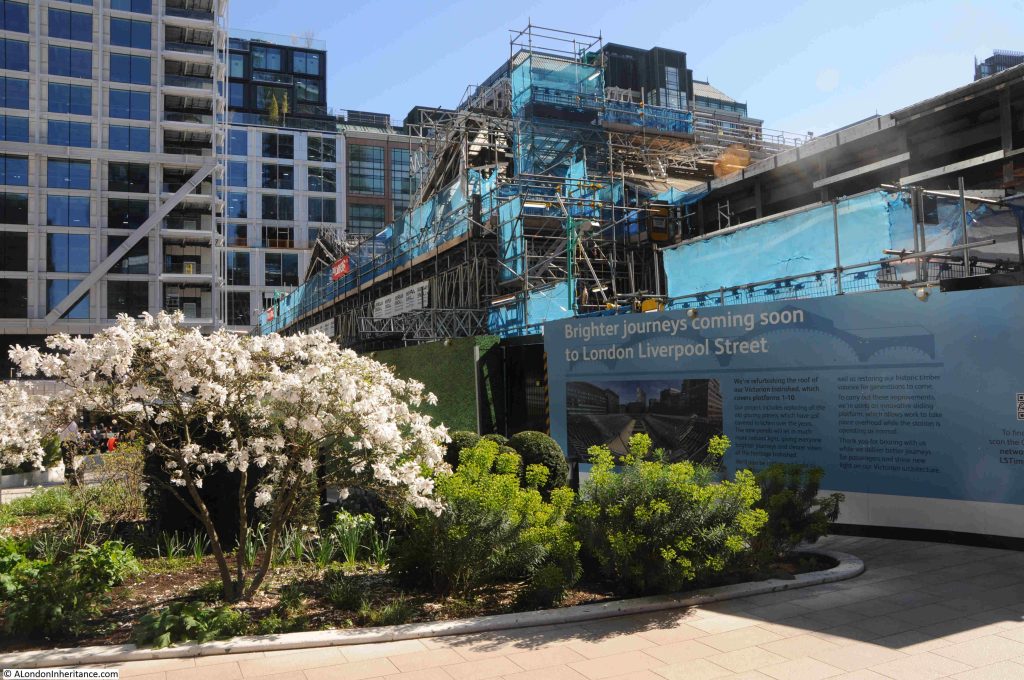 From Exchange Square you can view the work being carried out on the roof of Liverpool Street Station, which includes replacing all the glass panels, and restoring the wooden valance, which is the decorative wooden panels hanging down from the roof of the station at the Exchange Square end of the sheds.