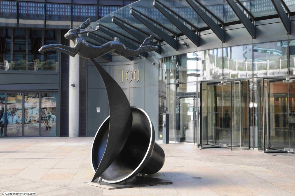 Hare and Bell is in the centre of the Broadgate Complex, and a leaping hare, frequently above a bell, was a common theme of many of Welsh sculptor Barry Flanagan’s work.