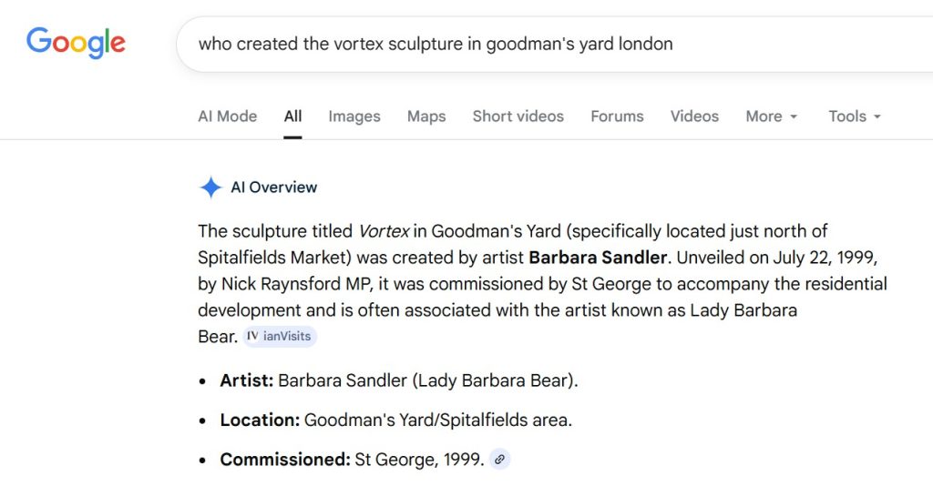 To illustrate my concerns about the errors and hallucinations of AI, I put the following into Google’s search box “who created the vortex sculpture in goodman’s yard London” as I was trying to find any information on the work. At the top of the search results was Google’s AI overview, pasted below: