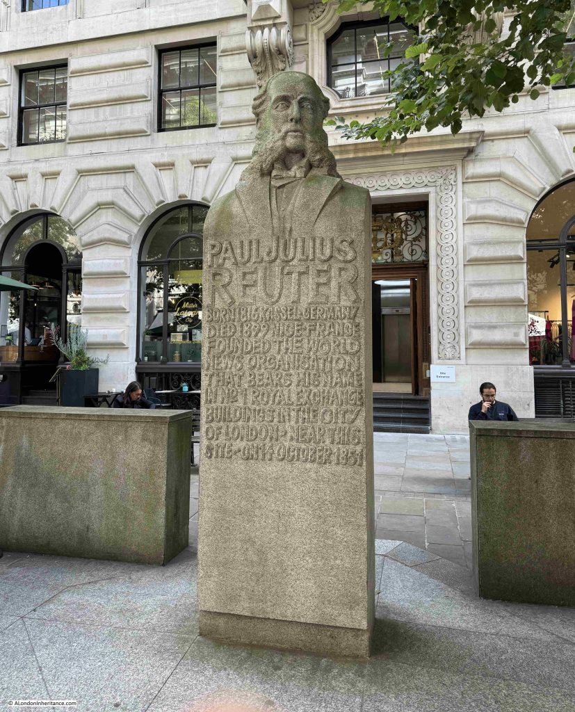 “Paul Julius Reuter. Born 1816 Kassel, Germany. Died 1899 Nice, France. Founded the world news organisation that bears his name in No. 1 Royal Exchange Buildings in the City of London, near this site, on 14 October 1851”.