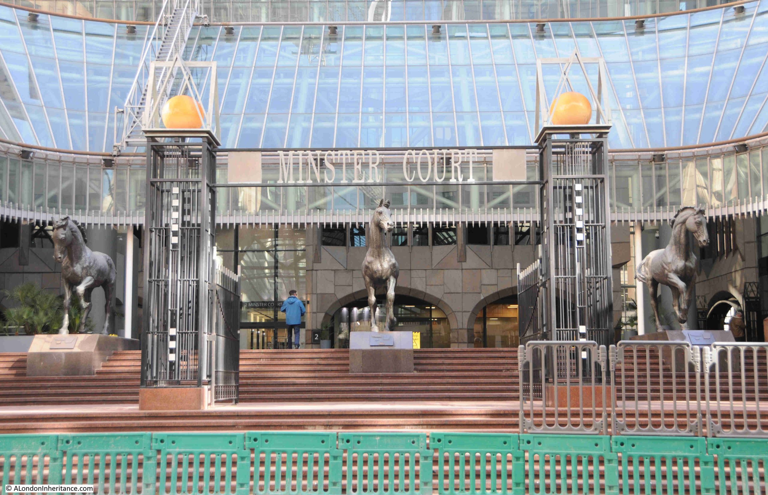 The main entrance from Mincing Lane is up a flight of steps to a wide open space, where the three bronze horses stand on plinths looking down the steps.