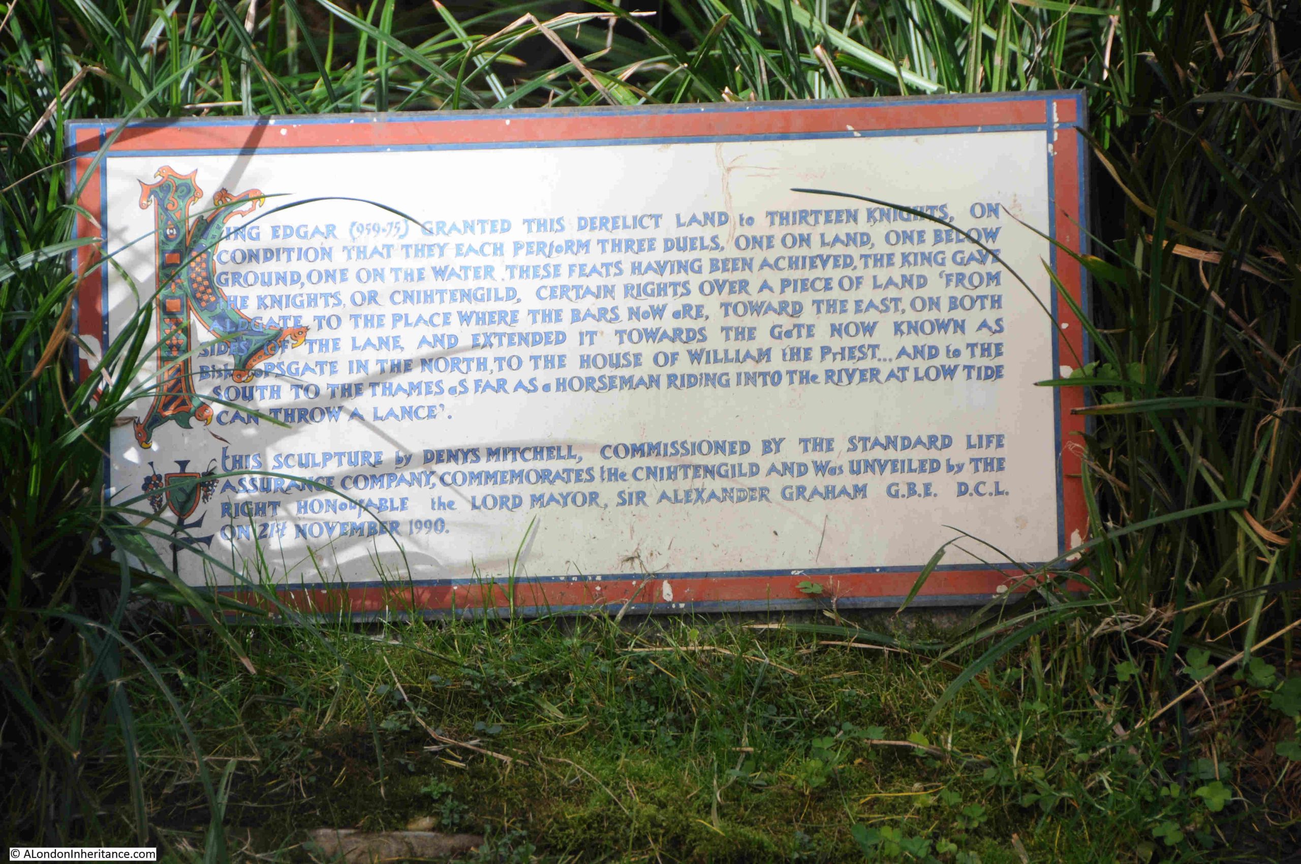 “King Edgar (959-75) granted this derelict land to thirteen knights on condition that they each perform three duels, one on land, one below ground, one on the water. These feats having been achieved the King gave the knights, or cnihtengild, certain rights over a piece of land from Aldgate to the place where the bars now are, towards the east, on both sides of the lane, and extended it towards the gate now known as Bishopsgate in the north to the house of William the First, and in the south to the Thames as far as a horseman riding into the river at low tide can throw a lance.”