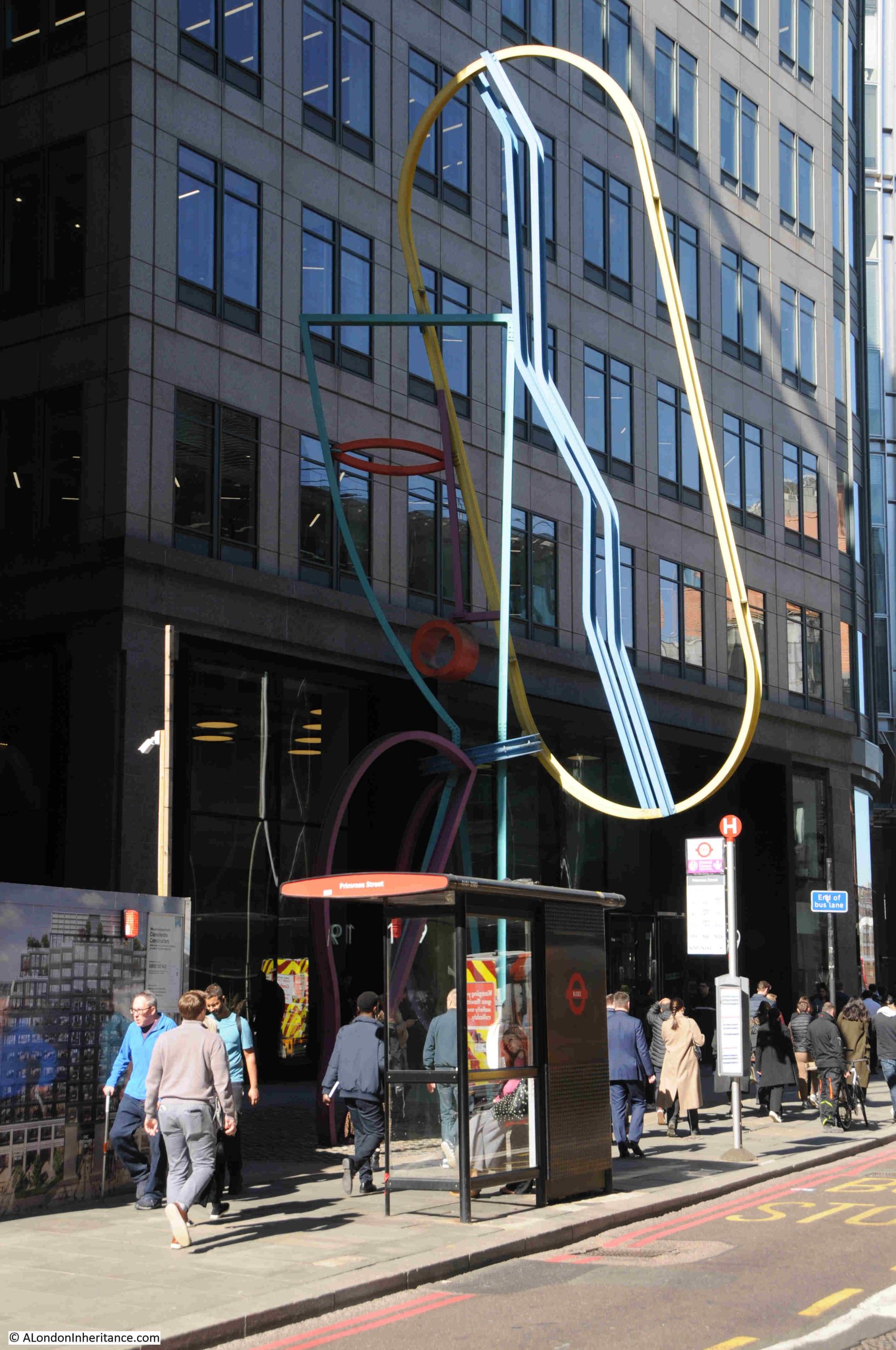 This work is alongside Bishopsgate by bus stop H, and is formed from bent metal rods, and painted in multiple colours.