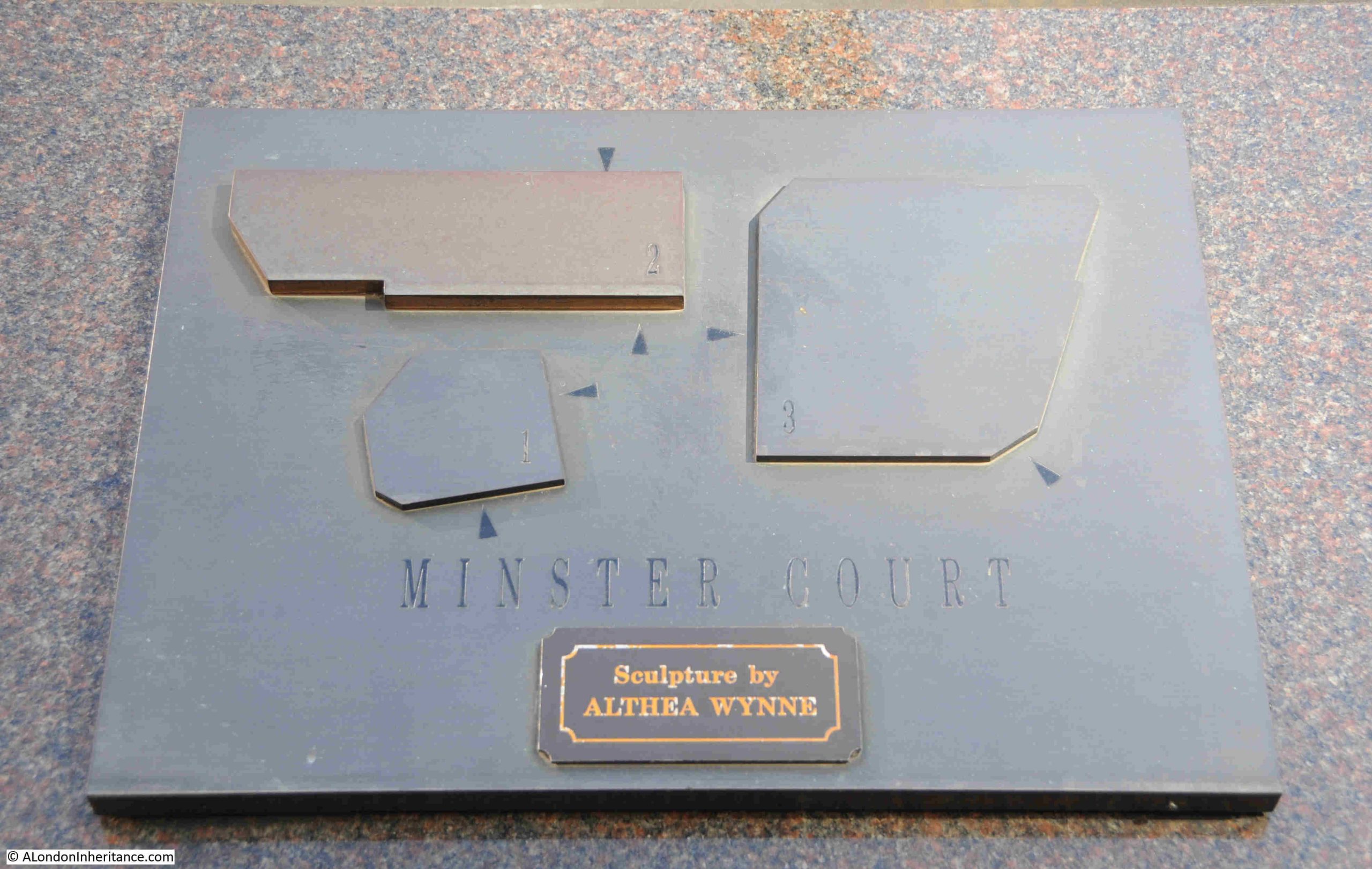 A plaque on one of the plinths records the name of the sculptor and also the layout of the three buildings, with arrows which I assume point to the entrances, although it may be a challenge to find those entrances given that there are no other reference points such as streets: