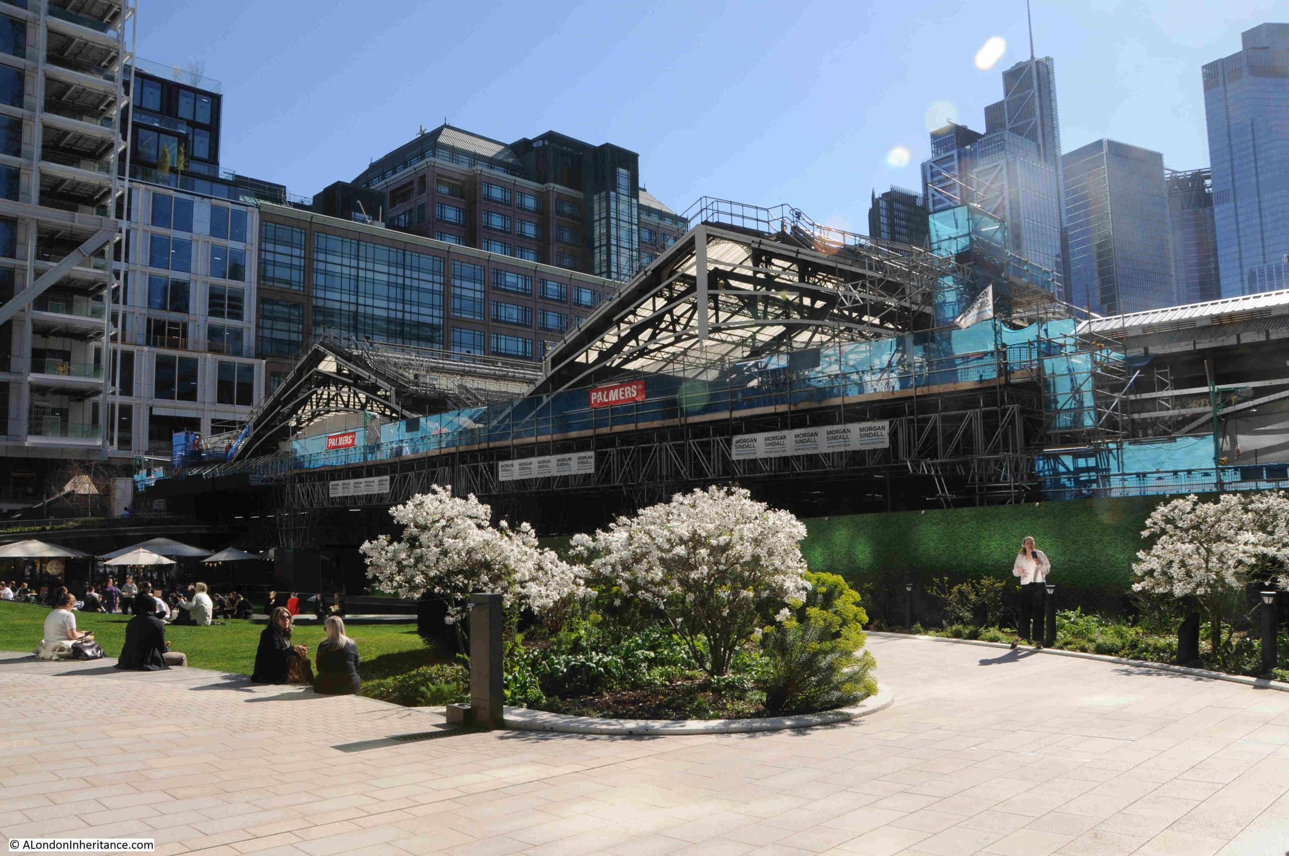 From Exchange Square you can view the work being carried out on the roof of Liverpool Street Station, which includes replacing all the glass panels, and restoring the wooden valance, which is the decorative wooden panels hanging down from the roof of the station at the Exchange Square end of the sheds.