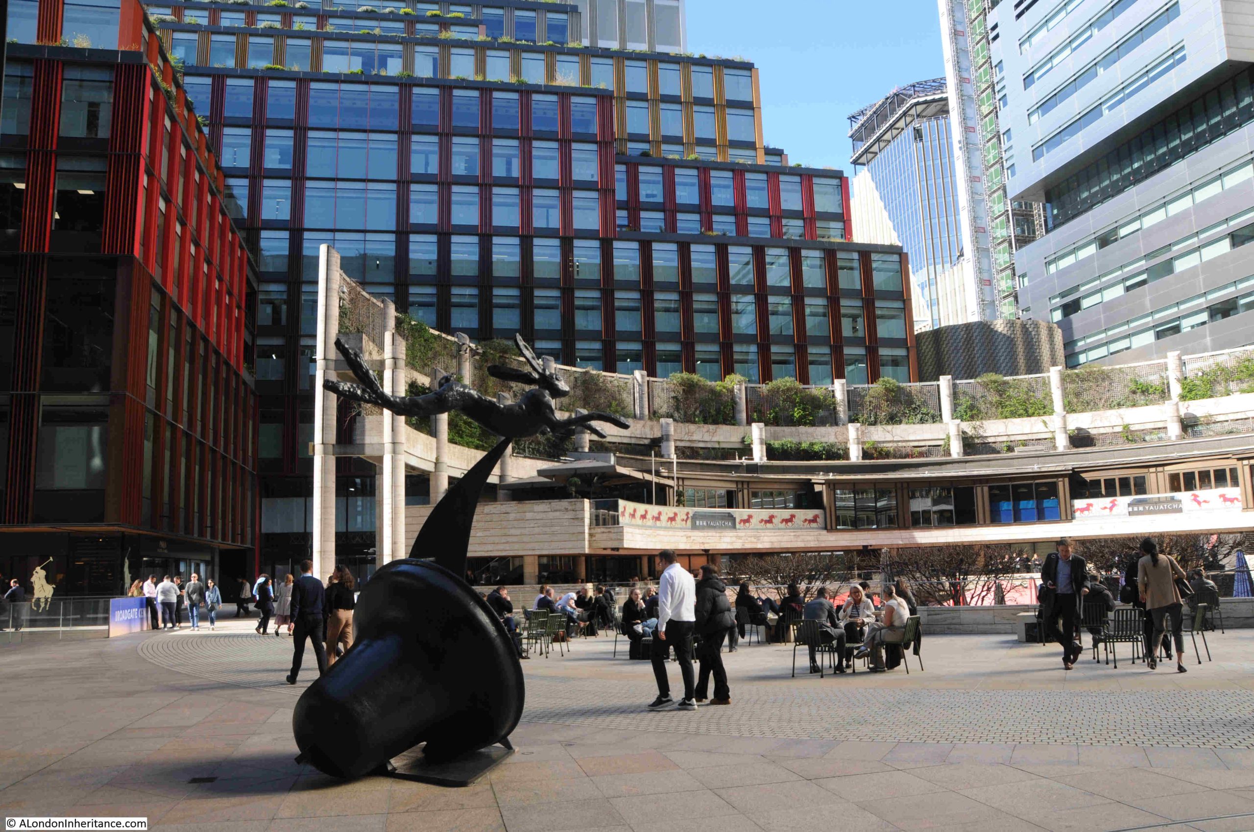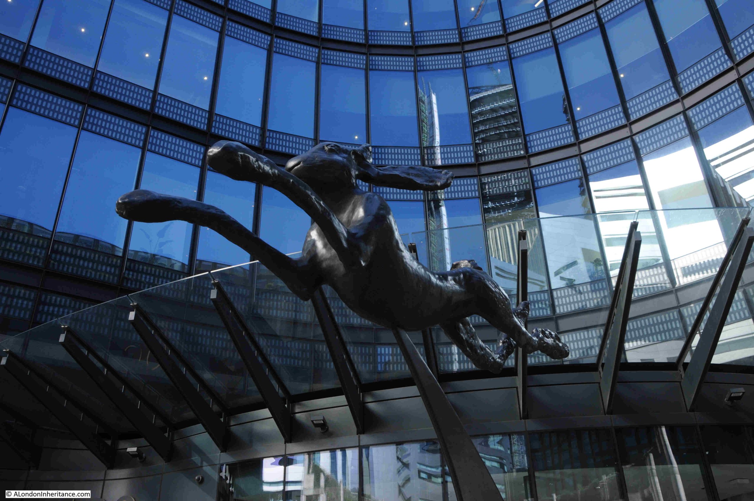 Hare and Bell is in the centre of the Broadgate Complex, and a leaping hare, frequently above a bell, was a common theme of many of Welsh sculptor Barry Flanagan’s work.