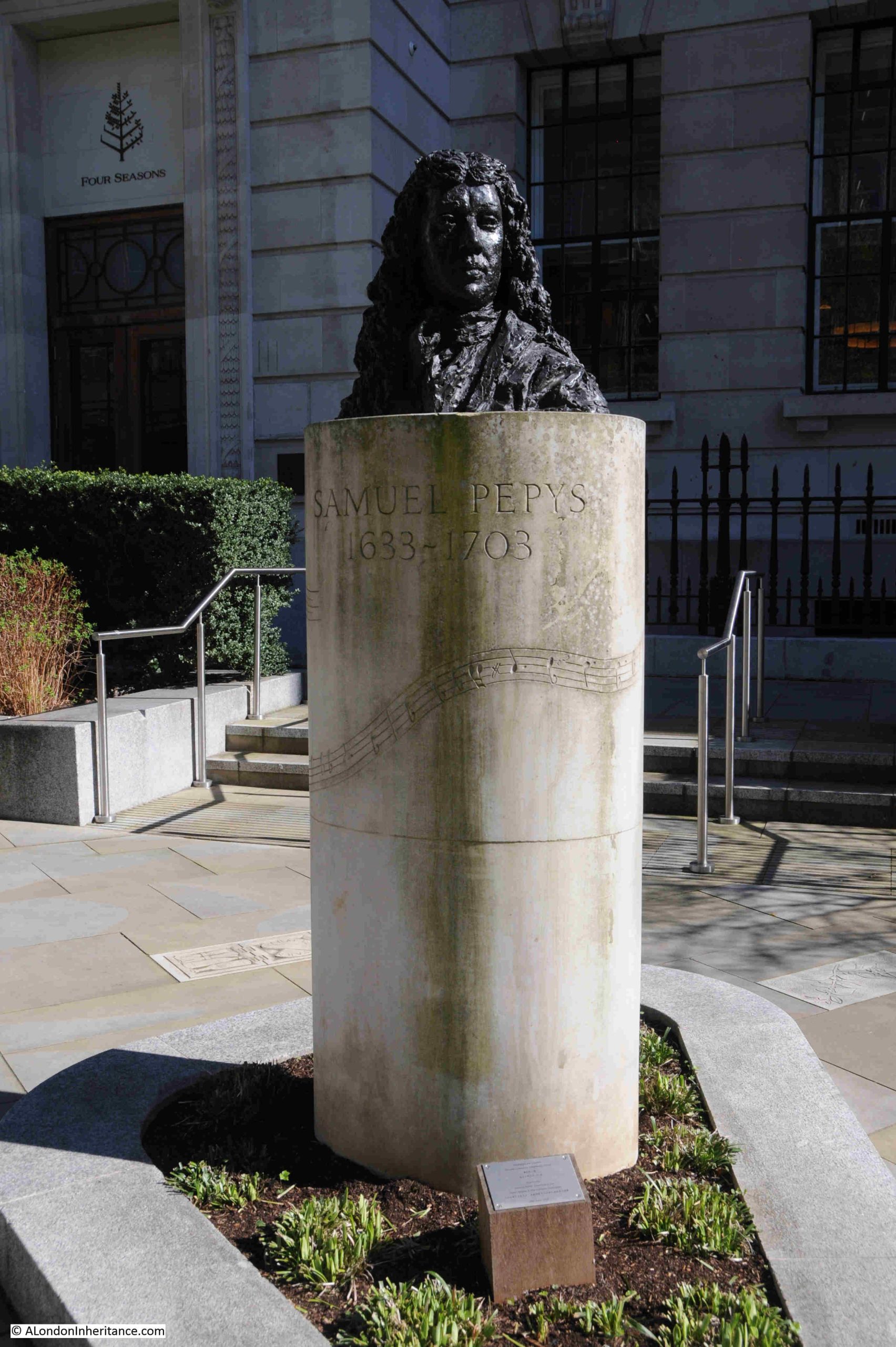 The bust of Samuel Pepys was moved to the centre of the garden as part of the redevelopment, and he can be seen on a pillar, at the centre and end of the path leading from Seething Lane: