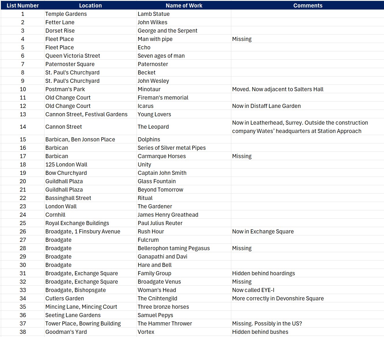 It has been an interesting exercise to walk the City to find the 38 works, to see what has survived, what has been lost or moved.