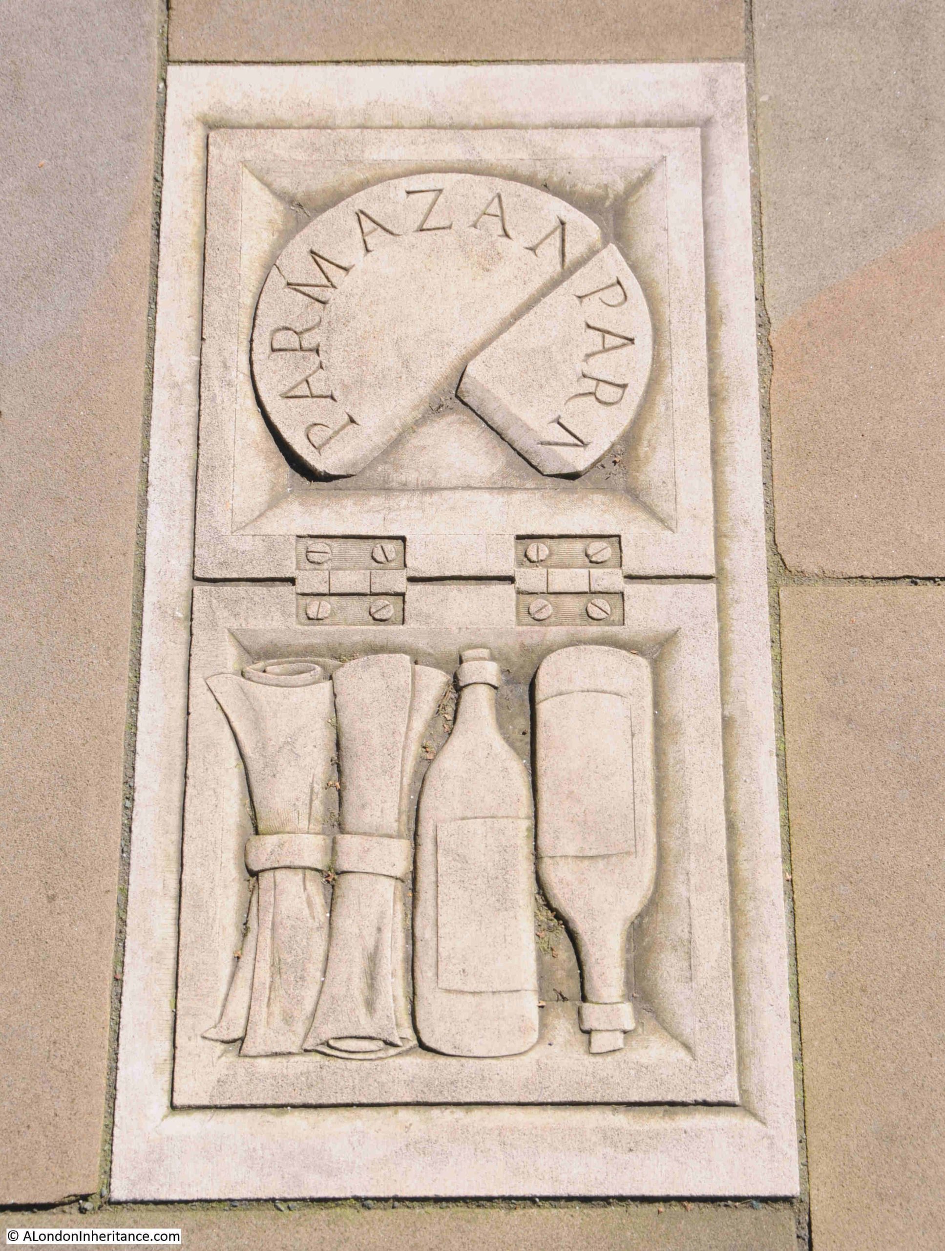 As the fire raged across the City, Pepys recorded in his diary “And in the evening Sir W. Pen and I did dig another, and put our wine in it; and I my Parmazan cheese, as well as my wine and some other things.”, and the Parmazan cheese, wine bottles and some papers are shown in a box on a paving slab: