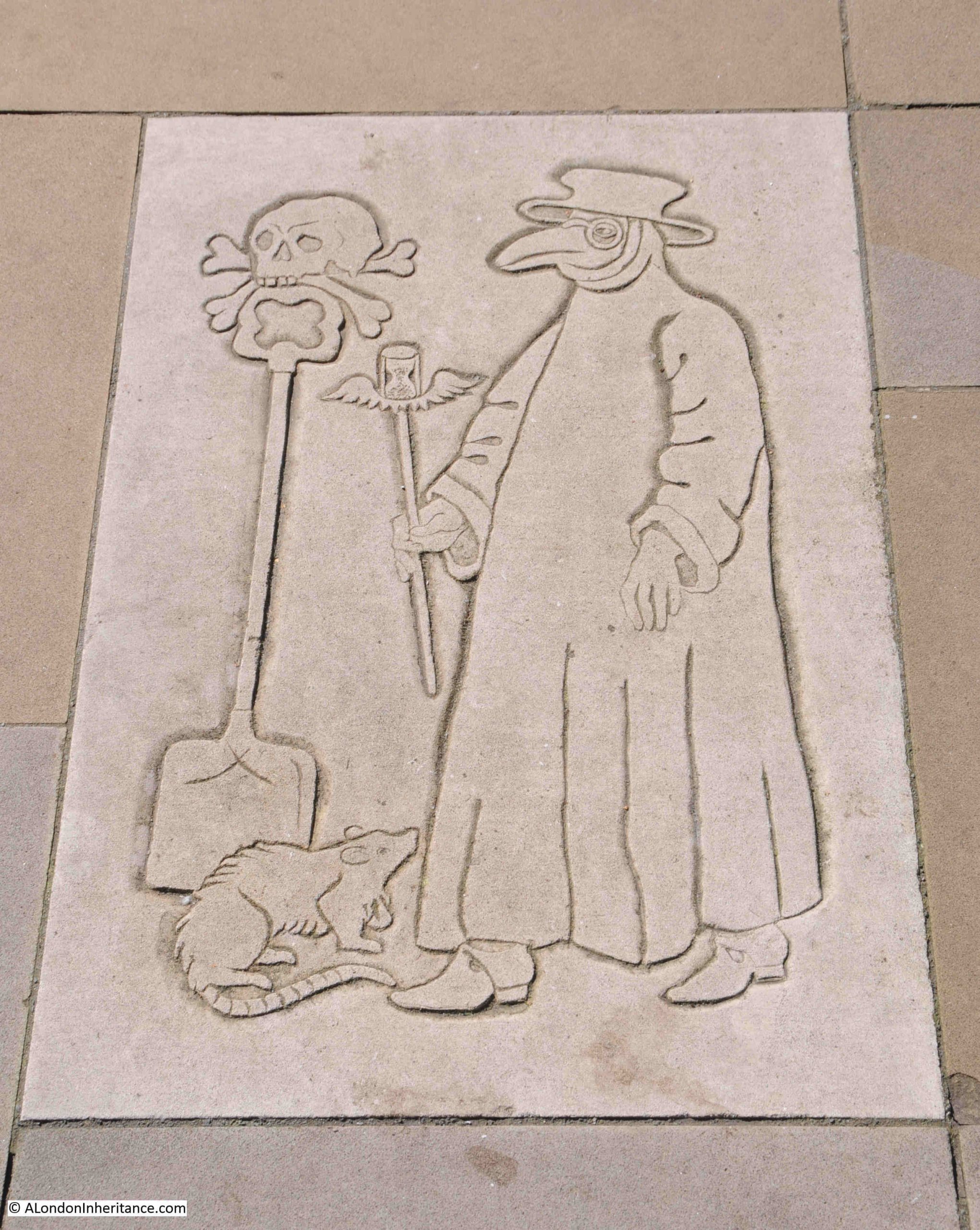 As well as the Great Fire, the other significant event in both Pepys and the life of London in the 1660s was the Plaque of 1665, and this is also illustrated in a couple of the paving slabs:
