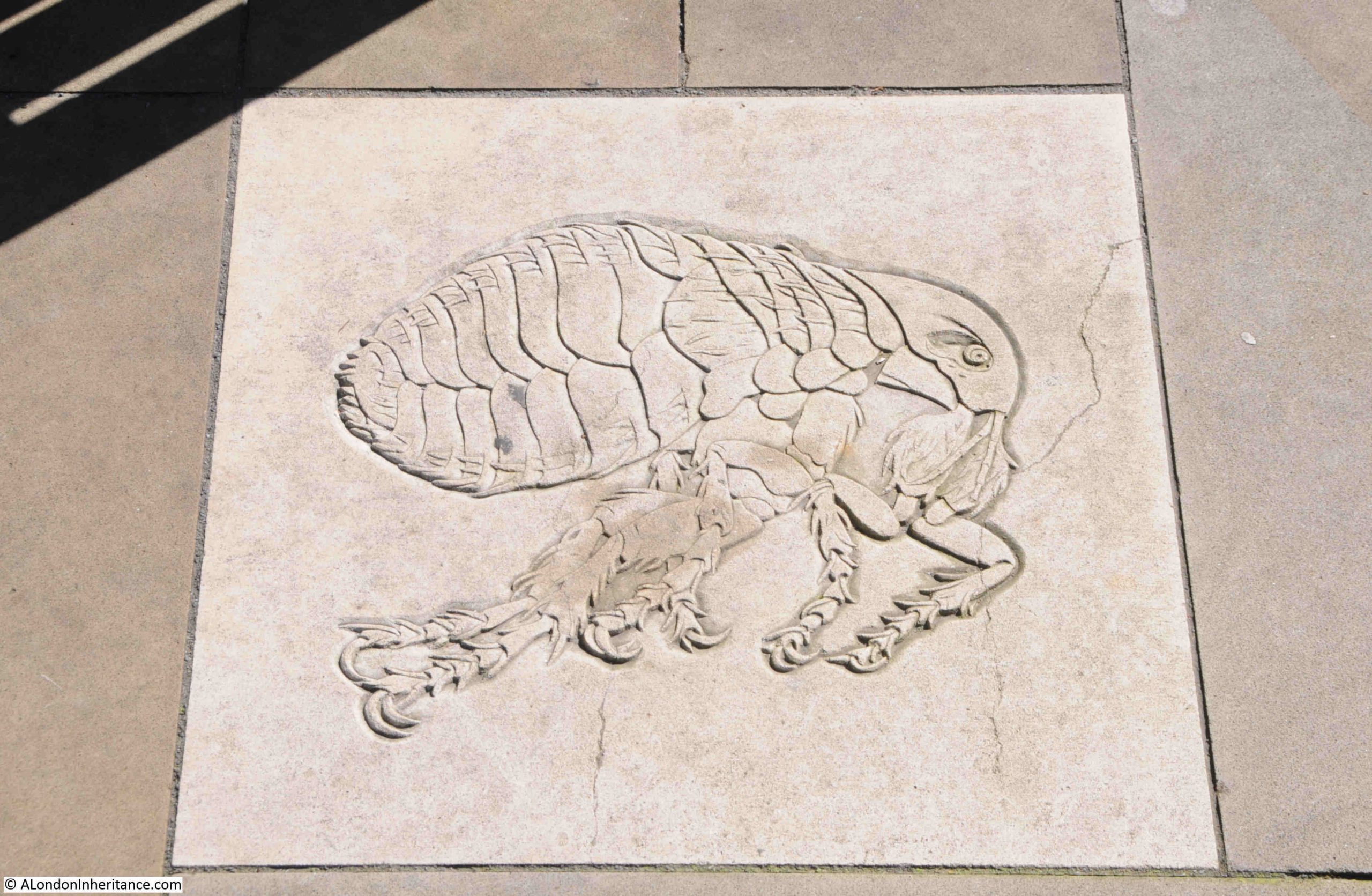 In the above illustration, a plaque doctor is shown wearing what at the time was believed to be a protective form of clothing. He is carrying an hour glass, which I assume is a reference to time. Next to him is a skull and crossbones on top of a spade, which could refer to the burial of the dead, and at his feet is a rat, which carried the fleas that transmitted the plaque, and a detailed illustration of one of the fleas is shown in another paving slab: