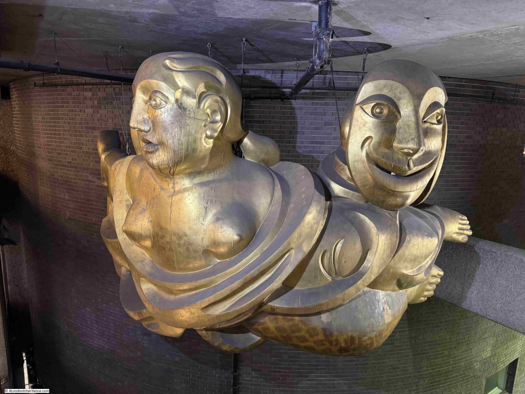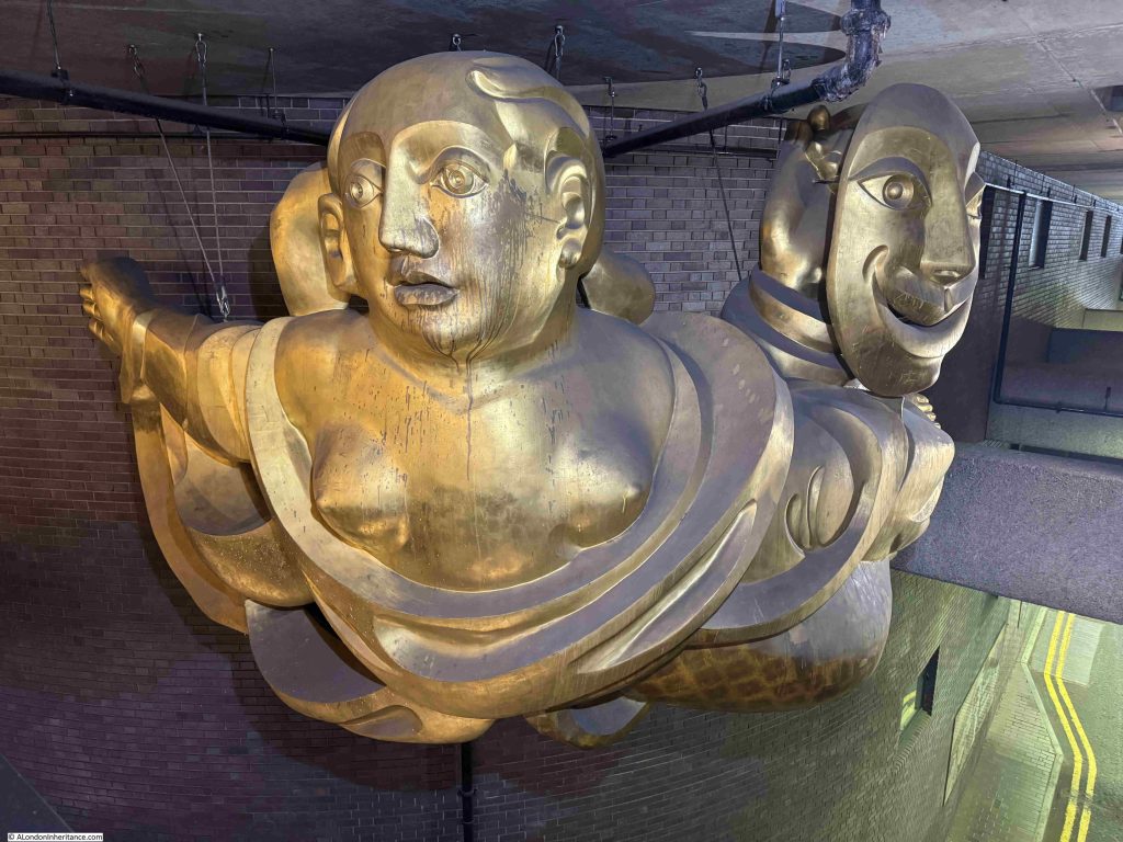 A short walk from Dorothy Annan’s Murals, at the northern end of the walkway under Gilbert House, is a sculpture made from polyurethane, glass fibre and gold leaf, titled the Barbican Muse, and created by Matthew Spender in 1994.