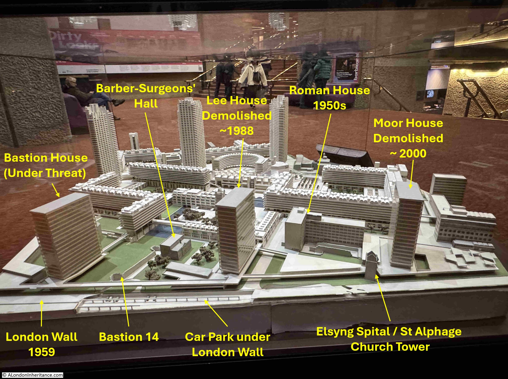 I have taken the view of the model as shown in the above photo, and added some labels to explain some of the features and changes outside the main Barbican development: