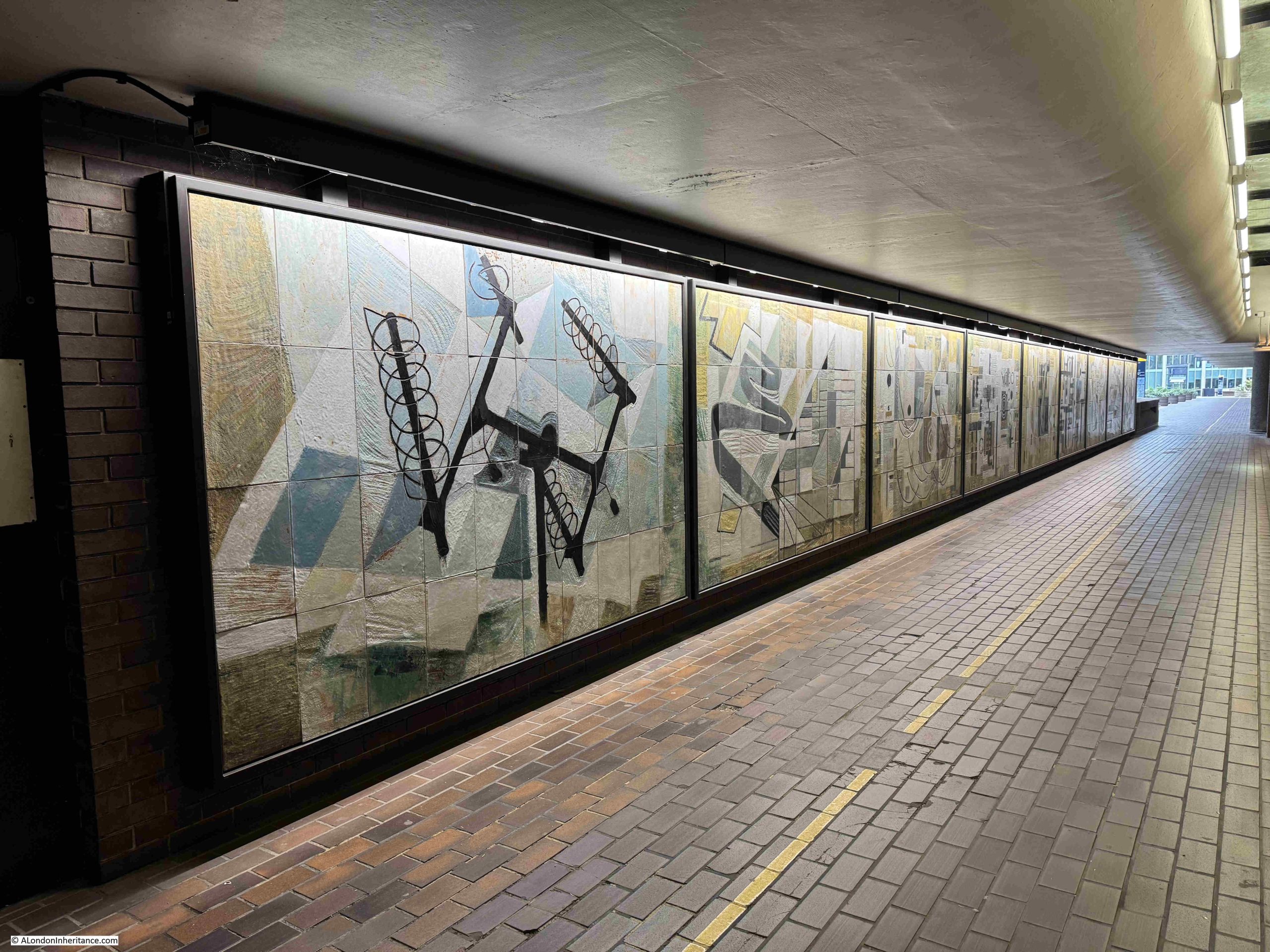 This post looks at four things which can be found during a casual wander of the Barbican estate. Objects which tell some of the Barbican’s story, development of the estate, and of the local area and the City of London, with the first being a set of remarkable murals: